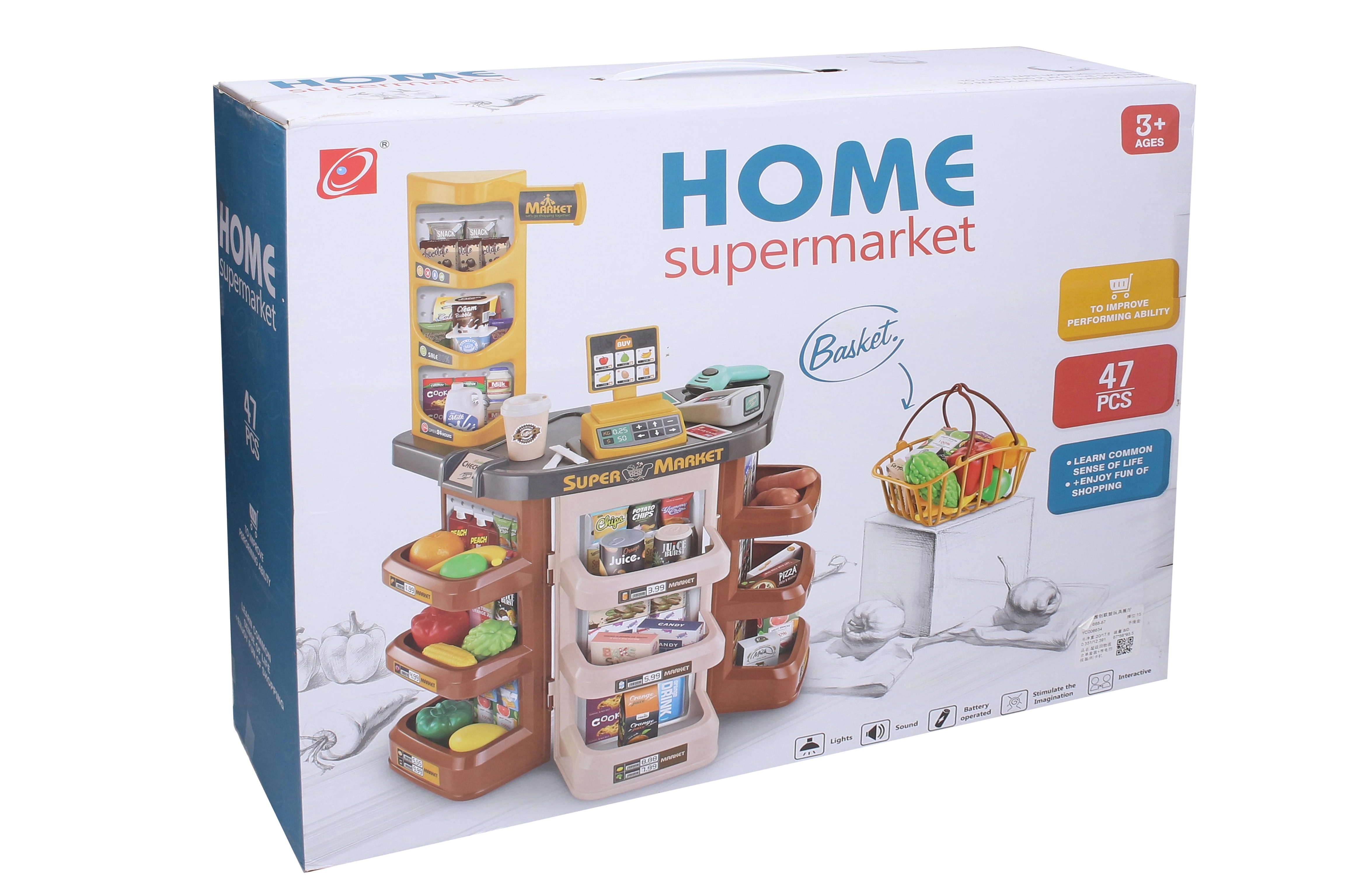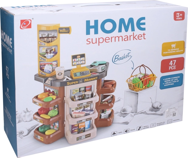 El set incluye el supermercado con mostrador, caja registradora, lector de códigos de barras, terminal de pago y tarjeta de pago. No faltan billetes, monedas, cesta de la compra y una variada selección de alimentos como fruta, verdura, leche, café, zumo, galletas, pizza o frutos secos. En la parte inferior del embalaje encontrarás un manual ilustrado para un montaje sencillo.