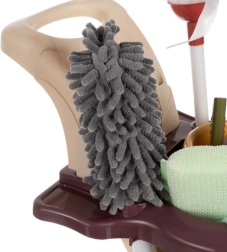 Cuatro ruedas anchas, dos estantes espaciosos y prácticos ganchos y orificios para guardar los utensilios. Los niños transportan fácilmente el cubo, la mopa, la escobilla y el pulverizador, y lo tienen todo organizado en un solo lugar.
