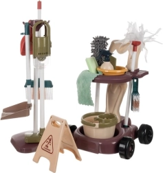 Mopa con cubo y escurridor, escoba, recogedores y cepillo de mano, plumero de microfibra, escobilla, esponjas, bayeta, cuenco, cartel de advertencia y bolitas que imitan suciedad.