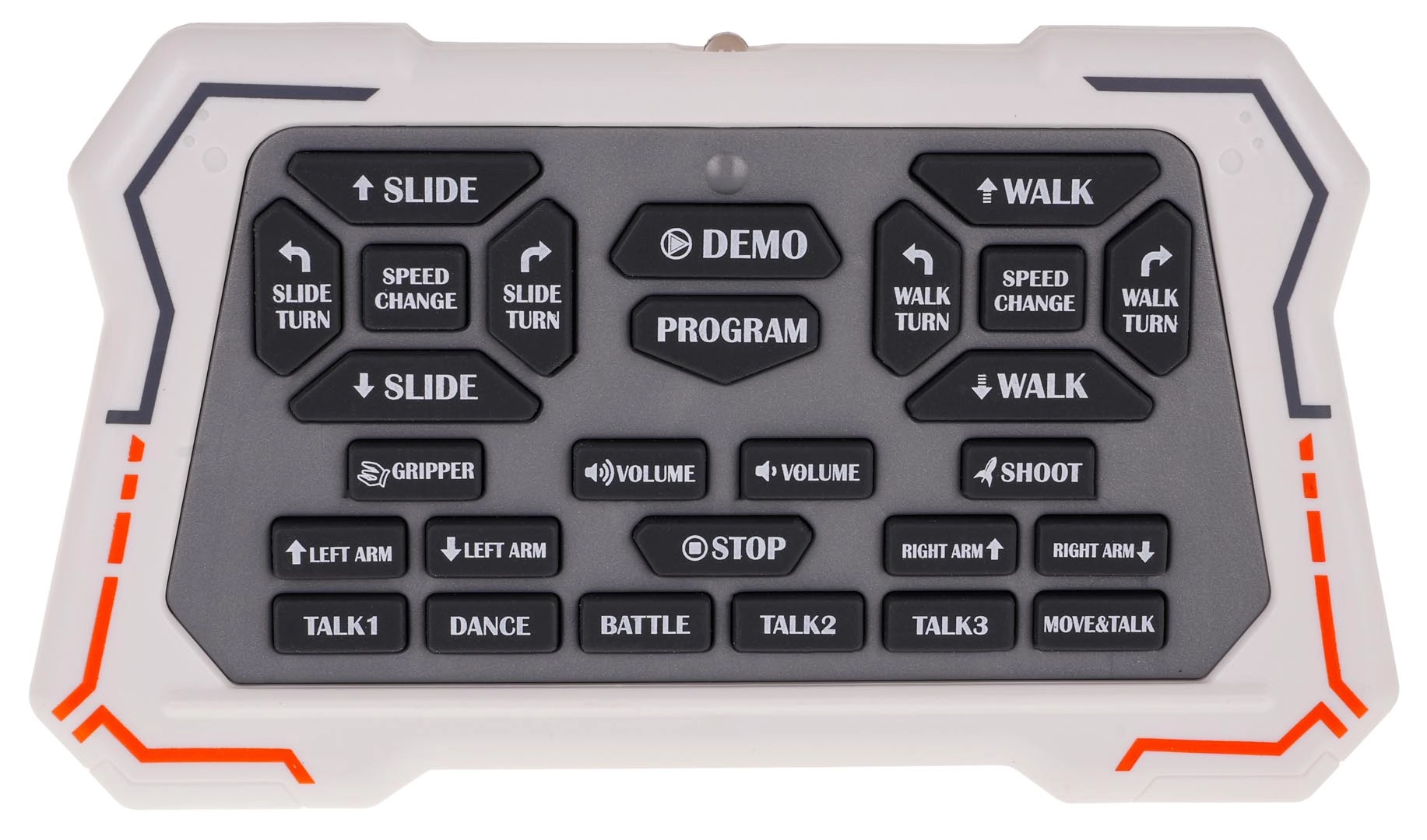 El robot incluye un lanzador funcional de dardos en el brazo derecho con cinco dardos de goma seguros. El brazo izquierdo está equipado con pinzas móviles, lo que permite una interacción interesante. Para garantizar la diversión óptima, dispone de un modo de dos velocidades y ajuste de volumen a través del mando.