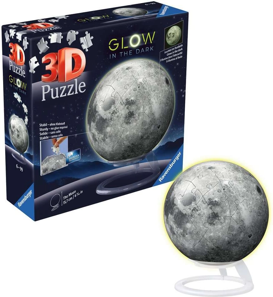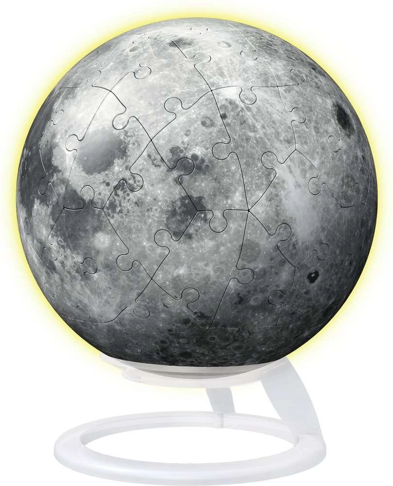 El Ravensburger 3D Puzzle Luminoso Luna combina diversión y decoración. Este puzzle incluye 73 piezas que, gracias a la tecnología EasyClick, se unen de forma fácil y precisa. Una vez montado, crean una esfera firme y estable.