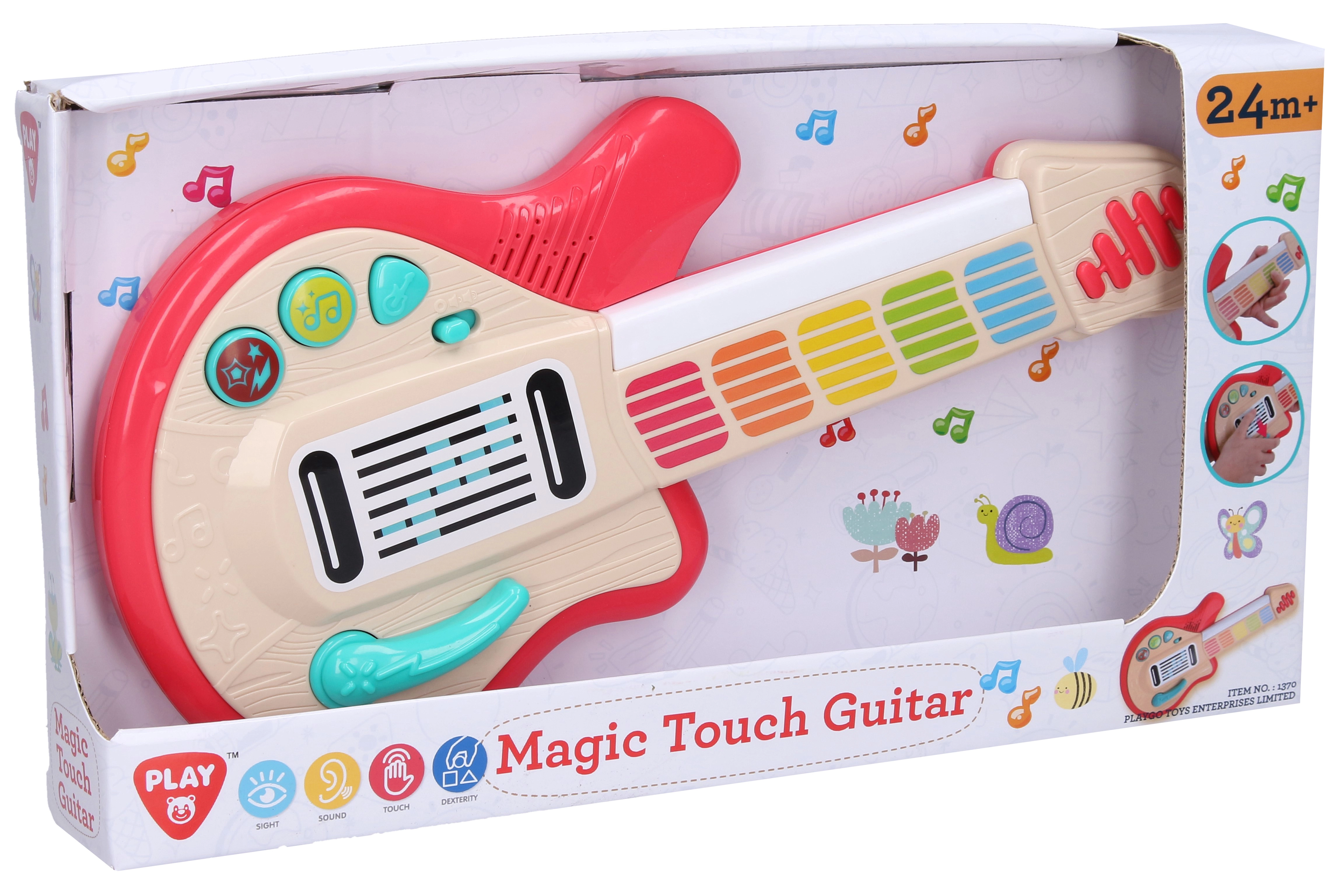 Descubre los primeros pasos musicales con la guitarra eléctrica táctil PLAYGO. Gracias a los sensores táctiles en el mástil y el cuerpo, el instrumento reacciona al toque suave y reproduce notas individuales. Los efectos de luz complementan la experiencia, mientras que los botones claros permiten cambiar melodías, distorsión y volumen.