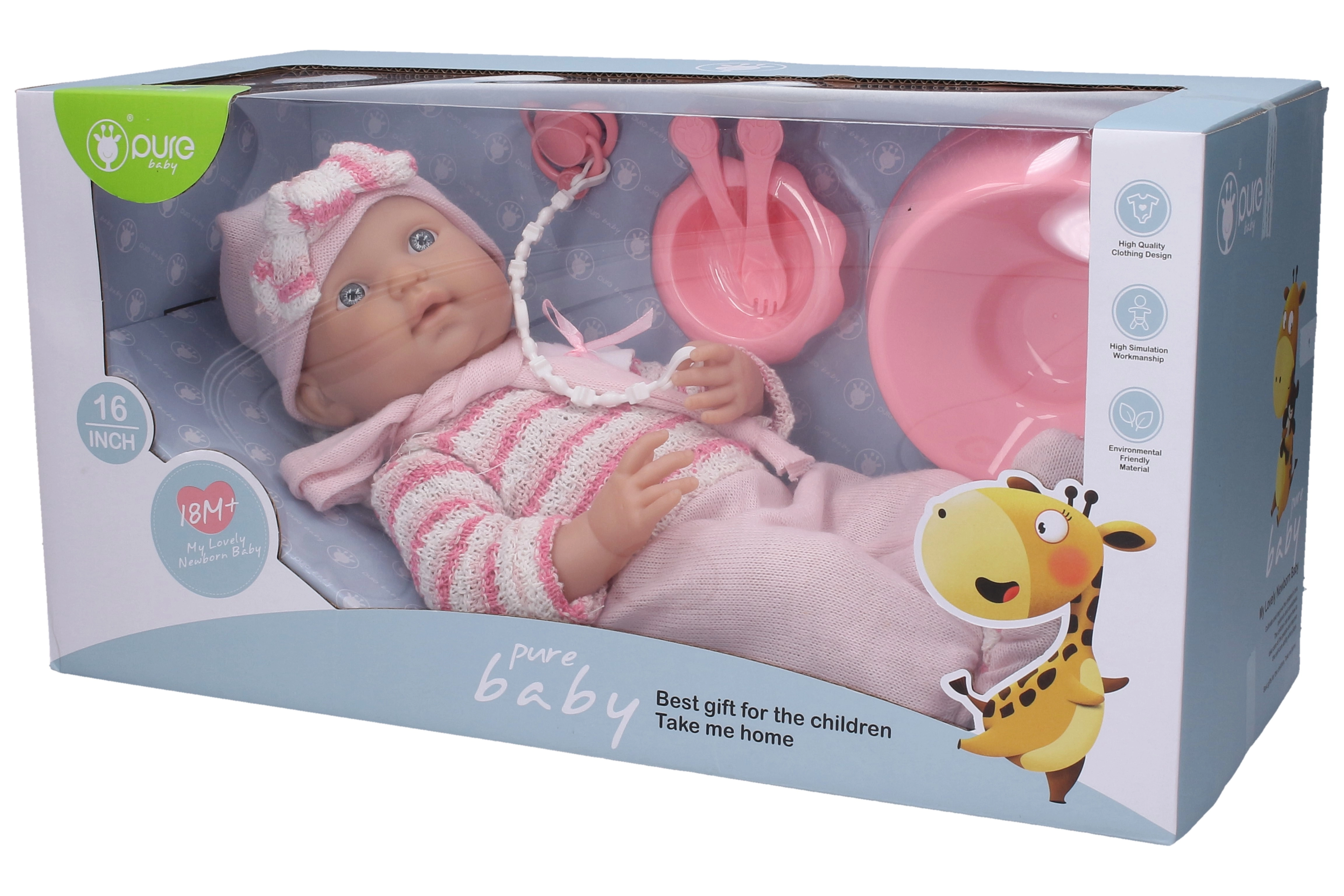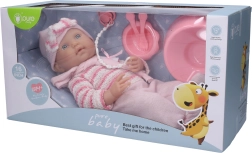 Este adorable bebé con un suave mono rosa encantará a cualquier pequeña mamá. La muñeca de 40 cm es ideal para jugar y cuidar, y viene con prácticos accesorios: orinal, cuenco, cubiertos y chupete para una experiencia de juego más realista.