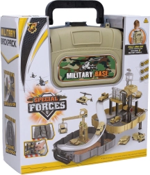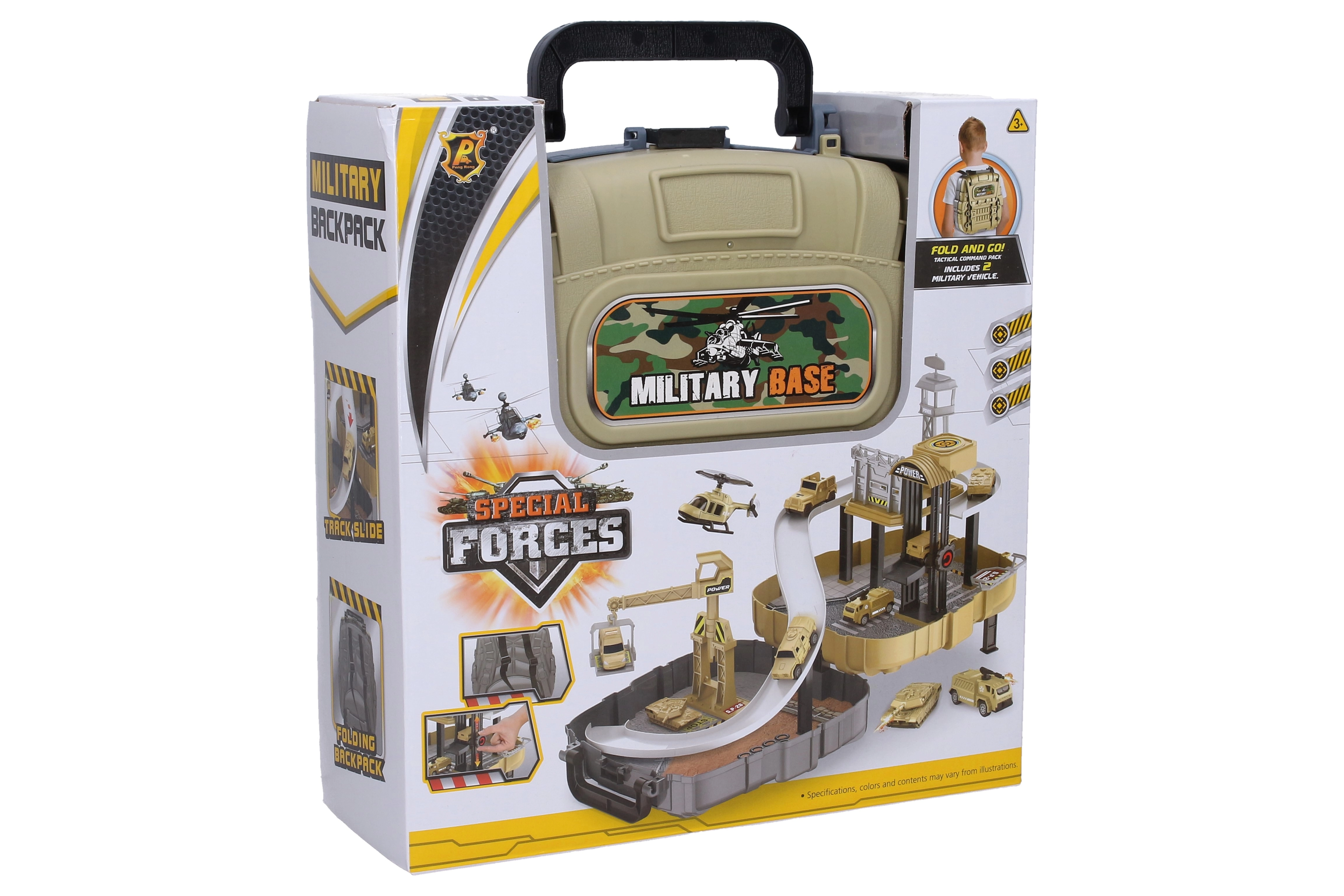 Set de aventura para pequeños entusiastas del ejército: estación militar con pista, ascensor, grúa, heliopuerto y 2 coches en una práctica mochila con tirantes. Ideal para casa y viajes, con manual ilustrado para un montaje sencillo.