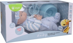 Adorable bebé con mono azul de 40 cm que alegrará a cualquier niño. El paquete incluye prácticos accesorios para jugar a cuidar: orinal, cuenco con cubiertos y chupete. Ideal para desarrollar la imaginación y las habilidades de cuidado.