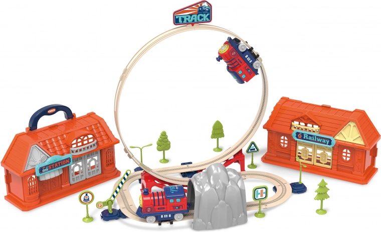 La locomotora está impulsada por 2× pilas AAA (no incluidas en el paquete) y se controla fácilmente mediante la chimenea como botón ON/OFF. El set incluye la vía, la locomotora, 2 edificios, parada, puente, barrera, señal de tráfico, árboles y luces. Gracias al manual ilustrado en la cara interna de la tarjeta del embalaje, el montaje es sencillo y rápido.