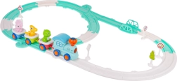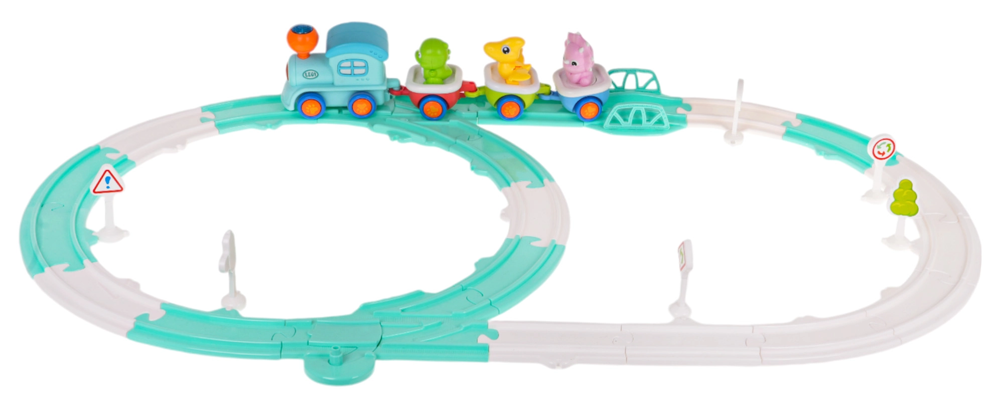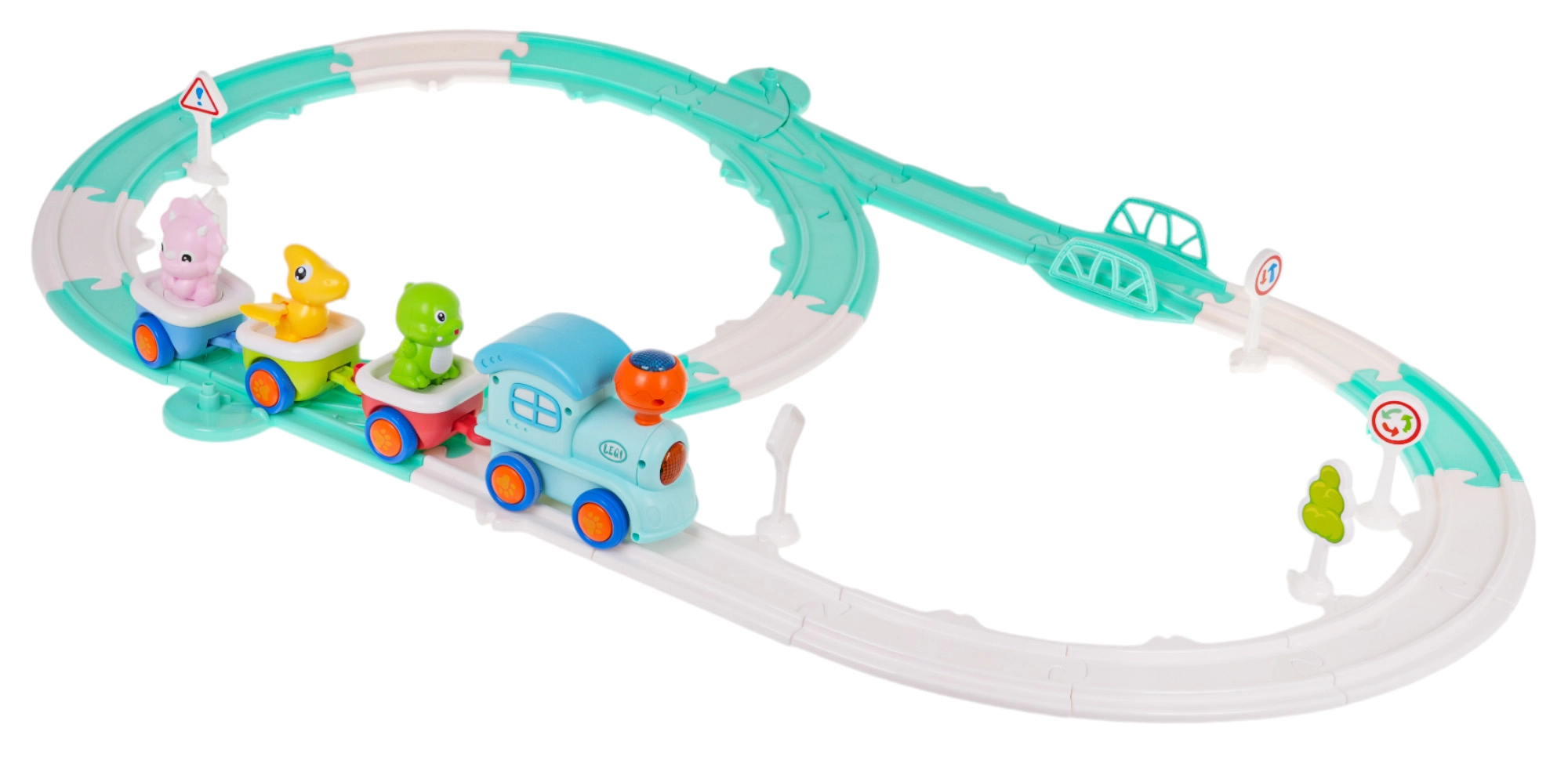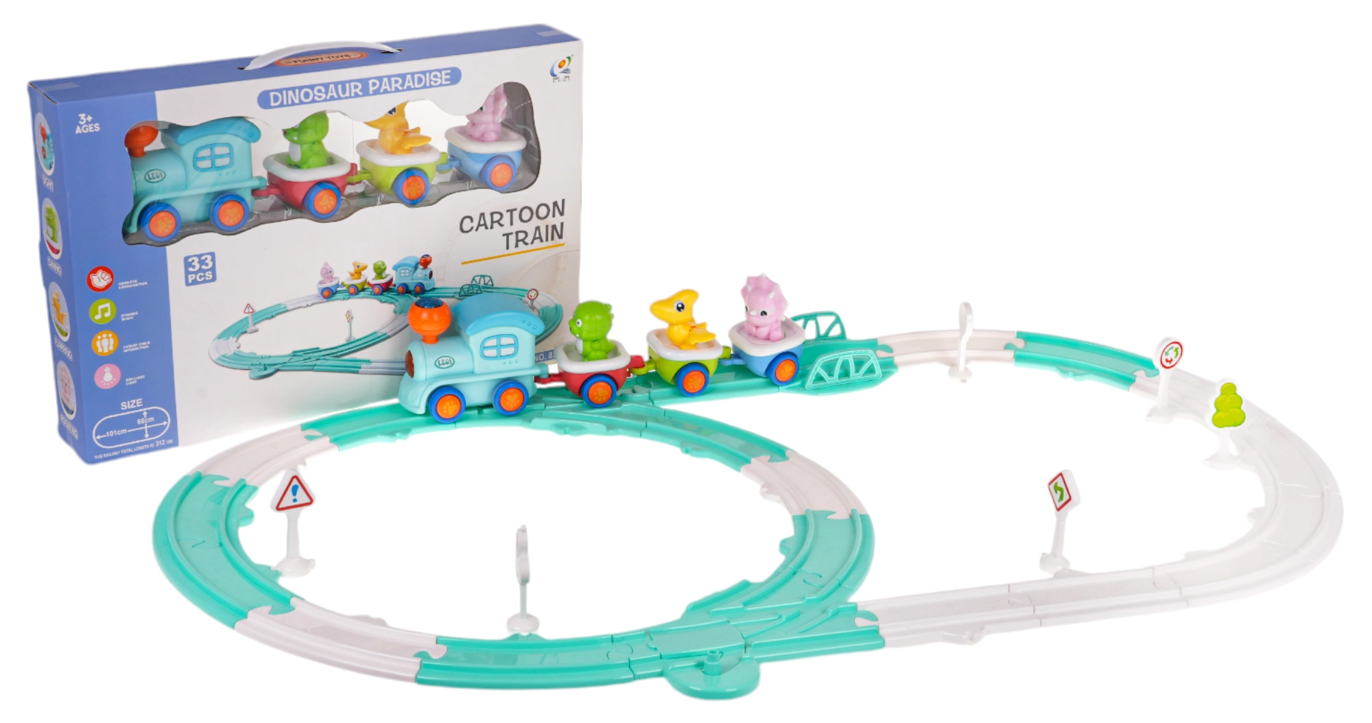 Desata la imaginación con la vía de tren infantil con dinosaurios: un colorido set de 33 piezas para niños a partir de 3 años. La locomotora a pilas ofrece efectos de luz y melodías alegres, y tres vagones desmontables transportan adorables figuras de dinosaurios. Las vías de fácil montaje, las señales de tráfico y el pequeño puente fomentan el juego creativo y el aprendizaje de las normas.