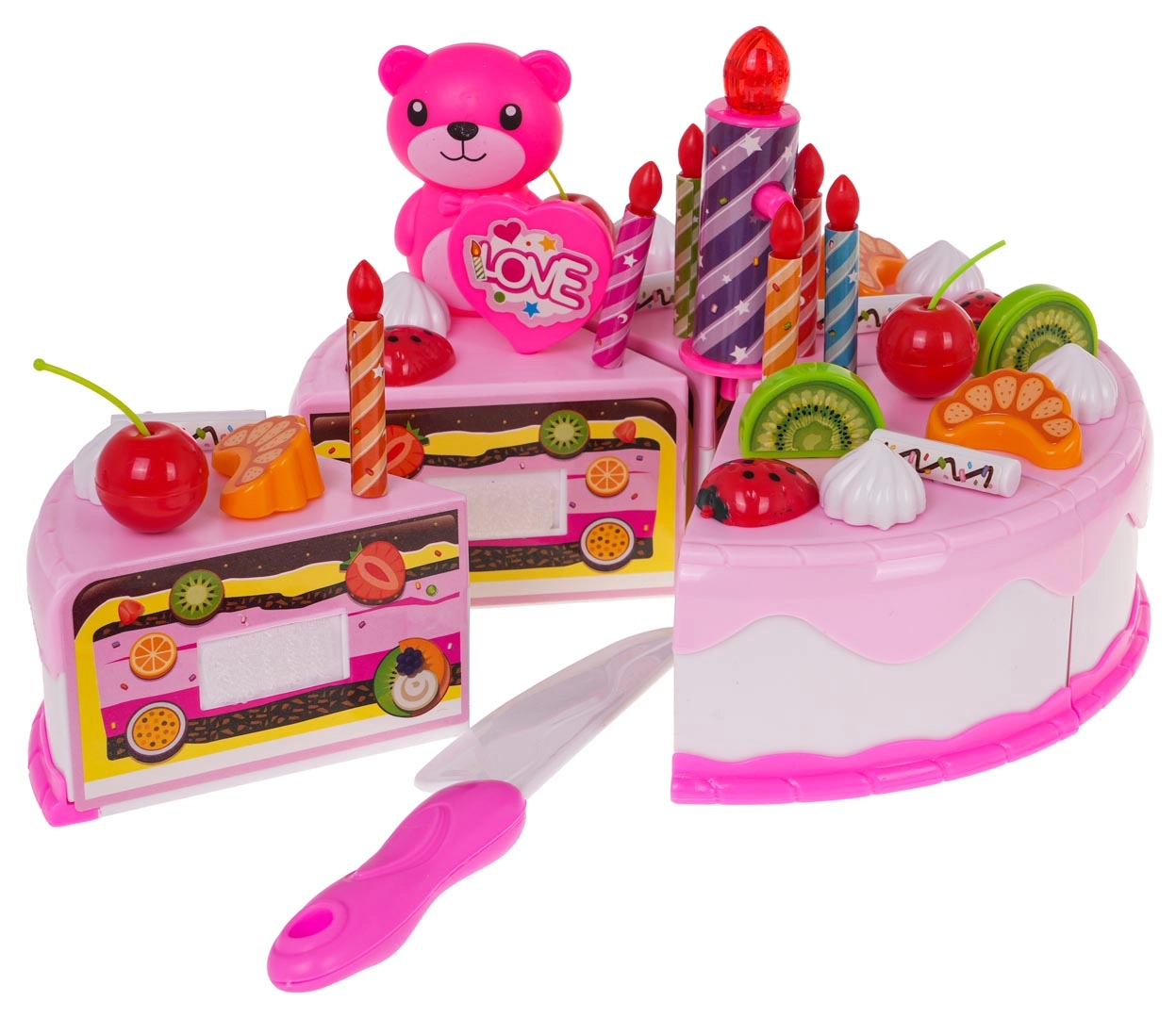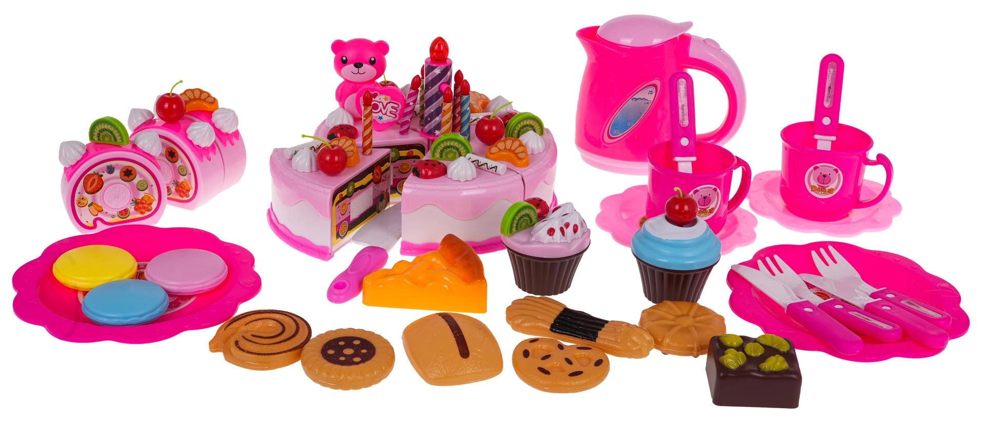 Este completo set de cumpleaños rosa transforma la habitación en una pequeña pastelería. El pastel de seis porciones unido con velcro se puede “cortar” con el cuchillo incluido y decorar con fruta, galletas y encantadores accesorios. La vela grande se ilumina en dos colores al presionarla (las baterías RL41 están incluidas), aportando un ambiente mágico a la celebración.