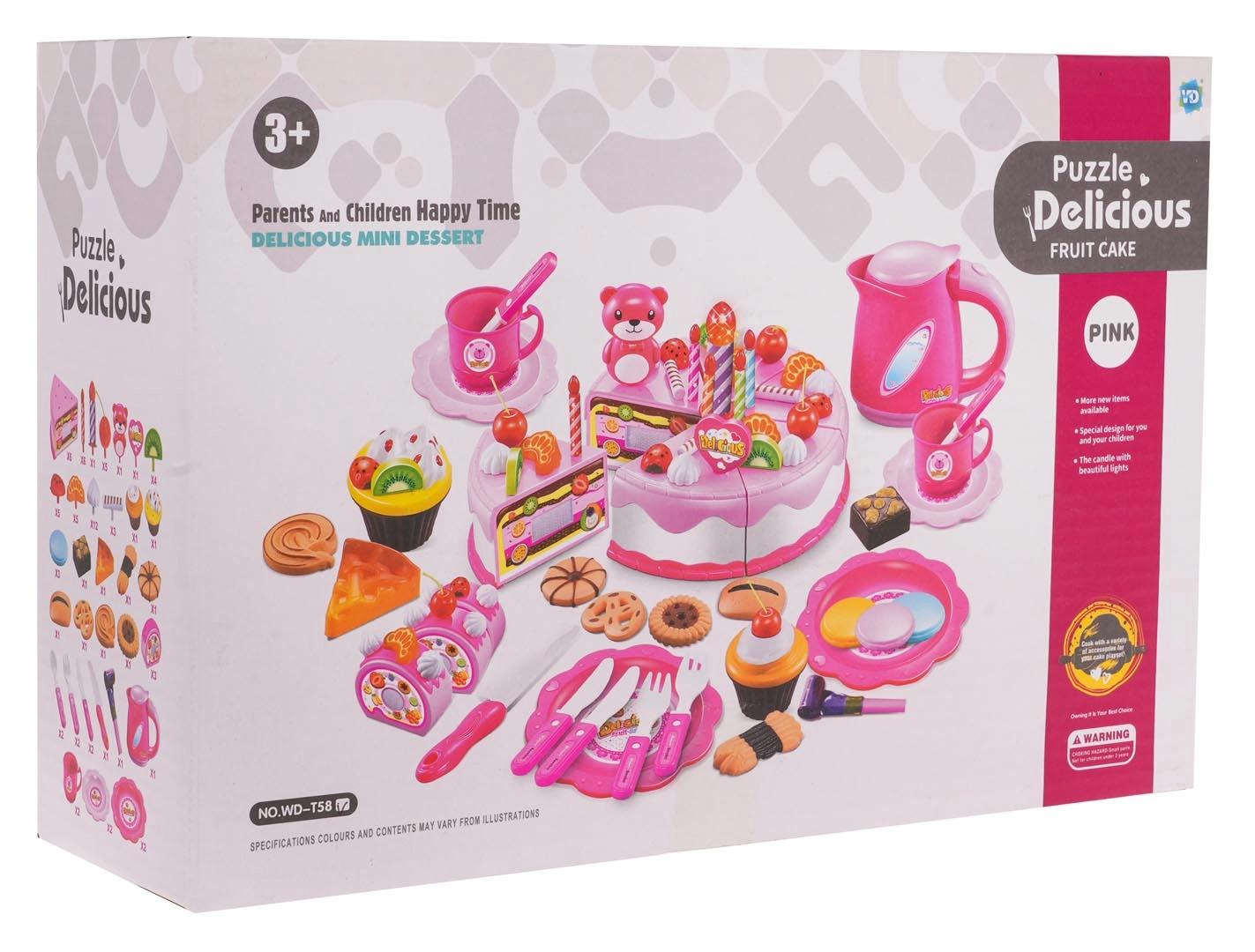 Seis porciones unidas con velcro pueden cortarse con el cuchillo incluido y volver a montarse. Decora el pastel con fruta, galletas y glaseados de colores según tu imaginación.