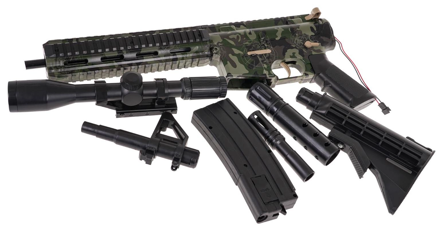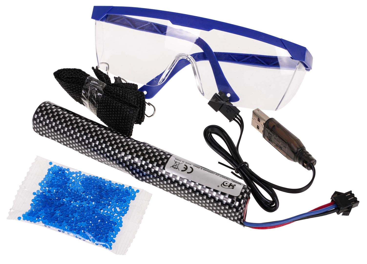 Las bolitas de gel de hidrogel se preparan fácilmente dejándolas en agua de 4 a 6 horas; aumentan su tamaño y, al impacto, se desintegran, sin ensuciar y de forma segura para el juego. Las piezas montables (cañón, silenciador, culata, cargador) permiten personalizar la apariencia y el equilibrio del arma. La alimentación corre a cargo de una batería recargable de 7,4 V con cable USB, para cargar prácticamente en cualquier lugar.
