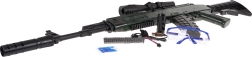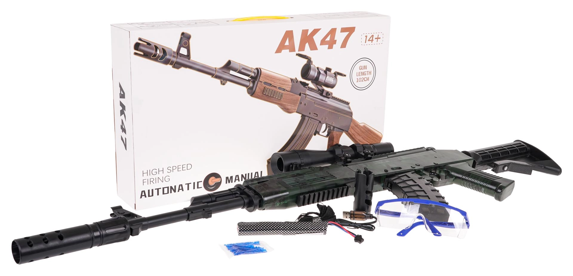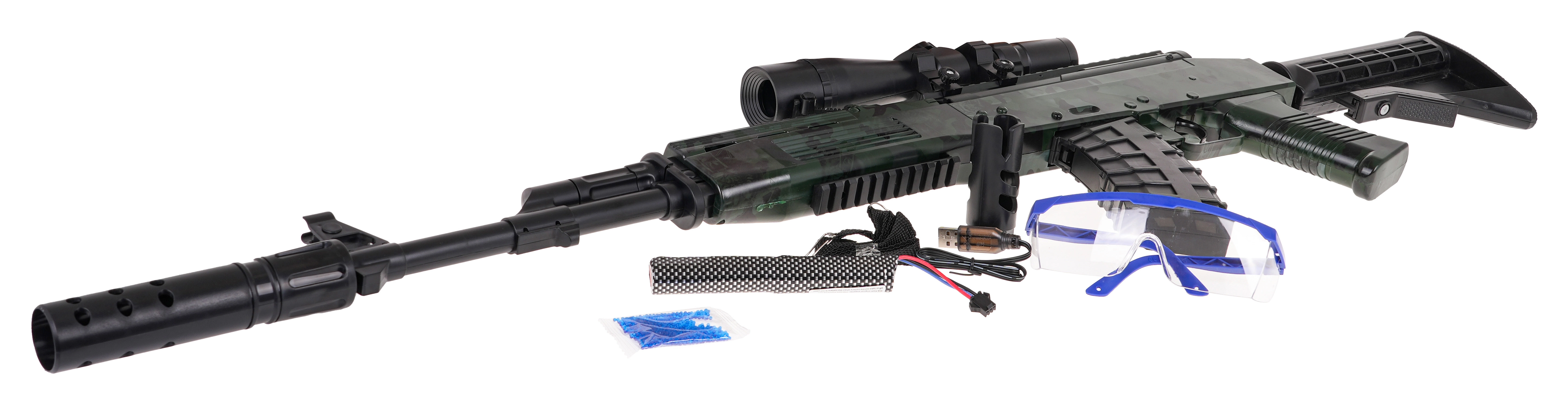Como munición se utilizan bolitas de hidrogel (diámetro recomendado aprox. 7–8 mm), que antes de usar se dejan en remojo 4–6 horas en agua. Tras la hidratación, escurre el agua y ya puedes jugar. Las bolitas estallan de forma segura al impacto, por lo que son adecuadas para uso recreativo. En el paquete encontrarás abundantes accesorios: cañón, silenciador, cargador, culata, mira, así como batería de 7,4 V con carga USB y gafas de protección.