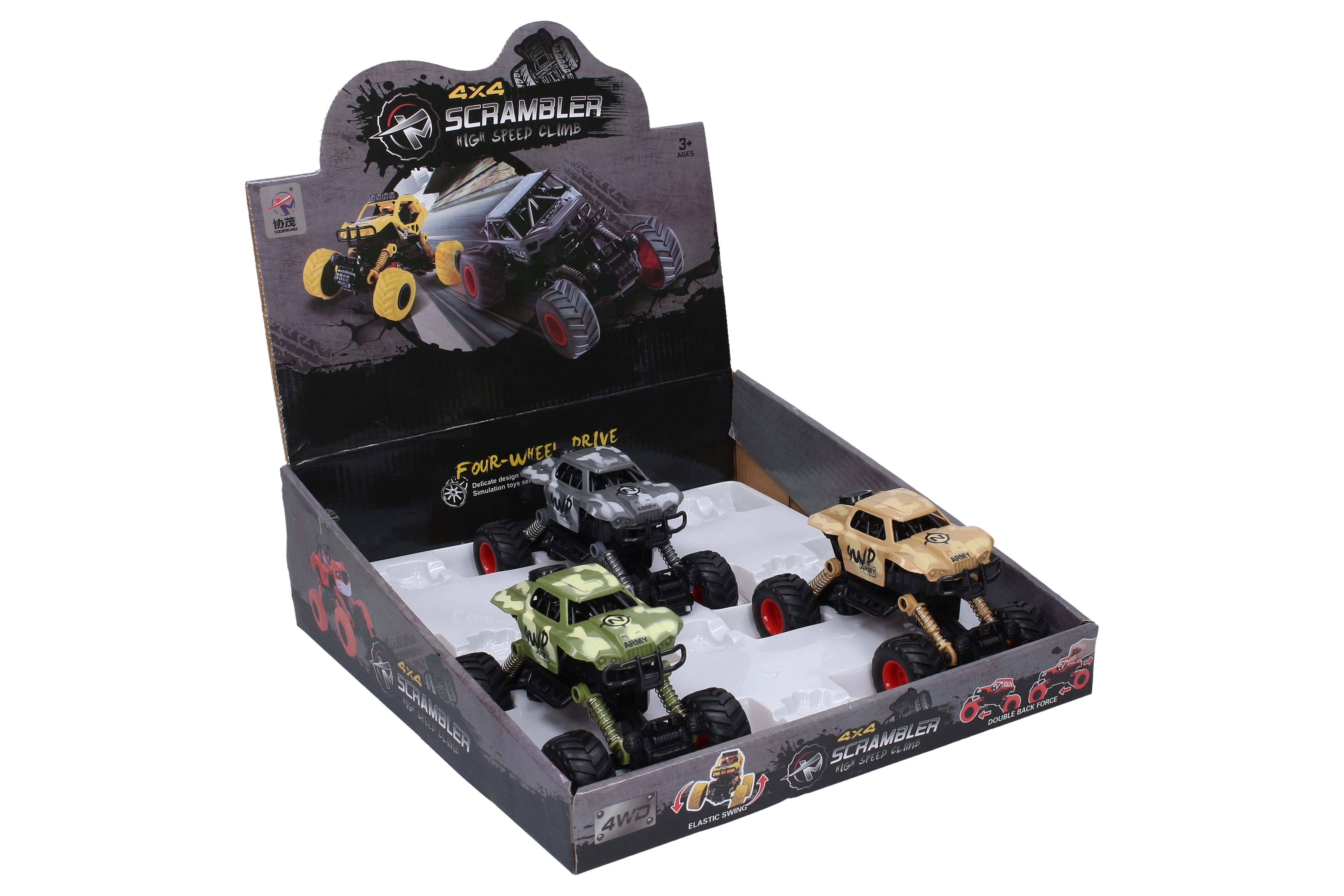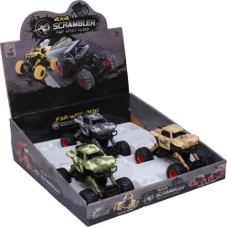 Divertido coche todoterreno con motor de arrastre para una conducción dinámica en cualquier terreno. Ofrece estructura robusta, suspensión funcional y dimensiones compactas de 15 × 9 × 9,3 cm. Disponible en 3 variantes de color – verde, amarillo, gris.