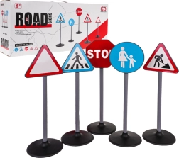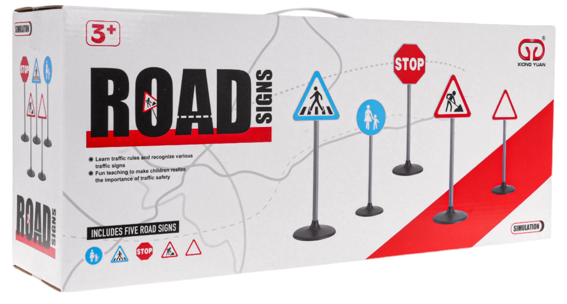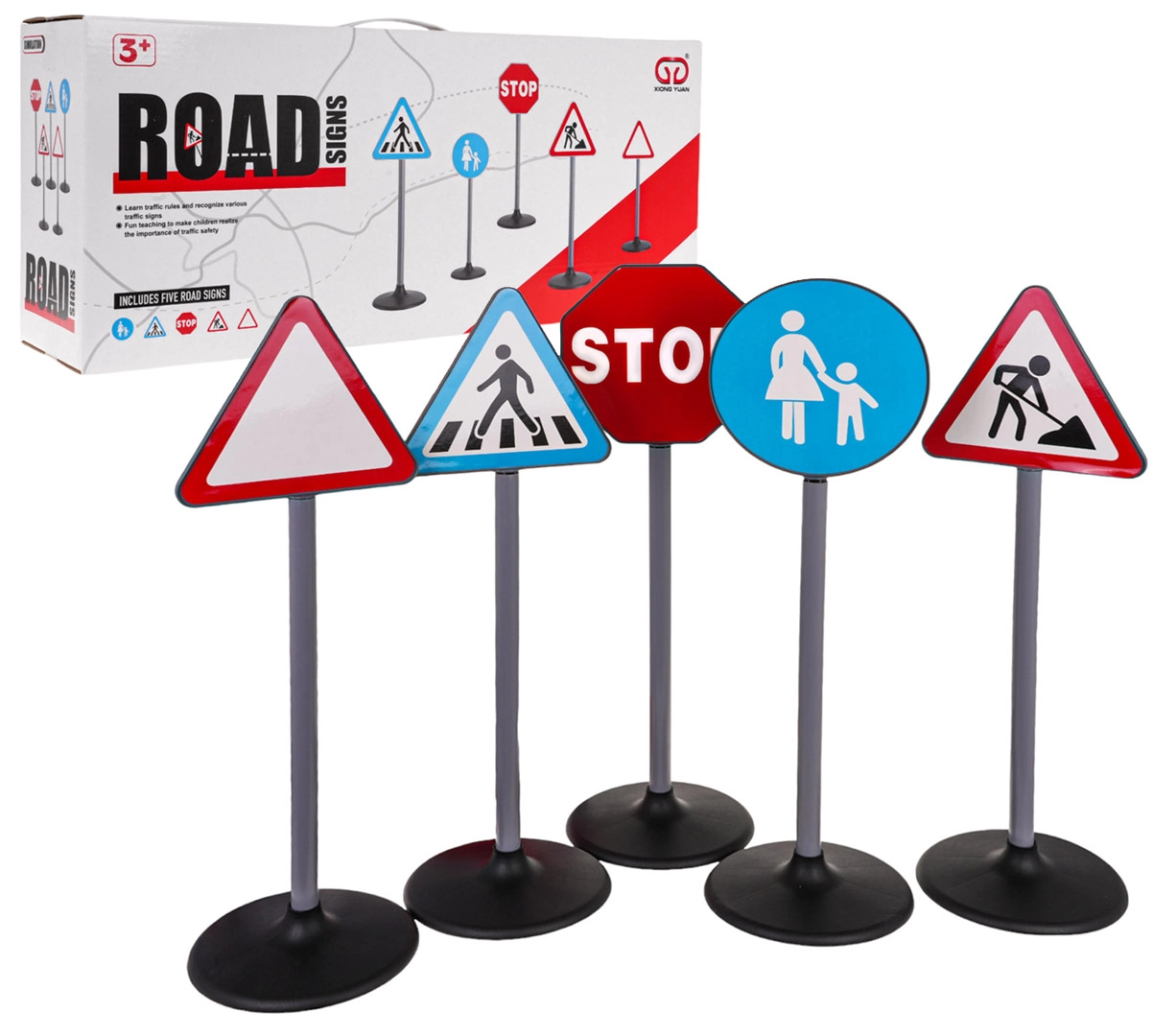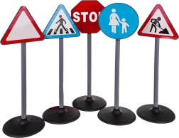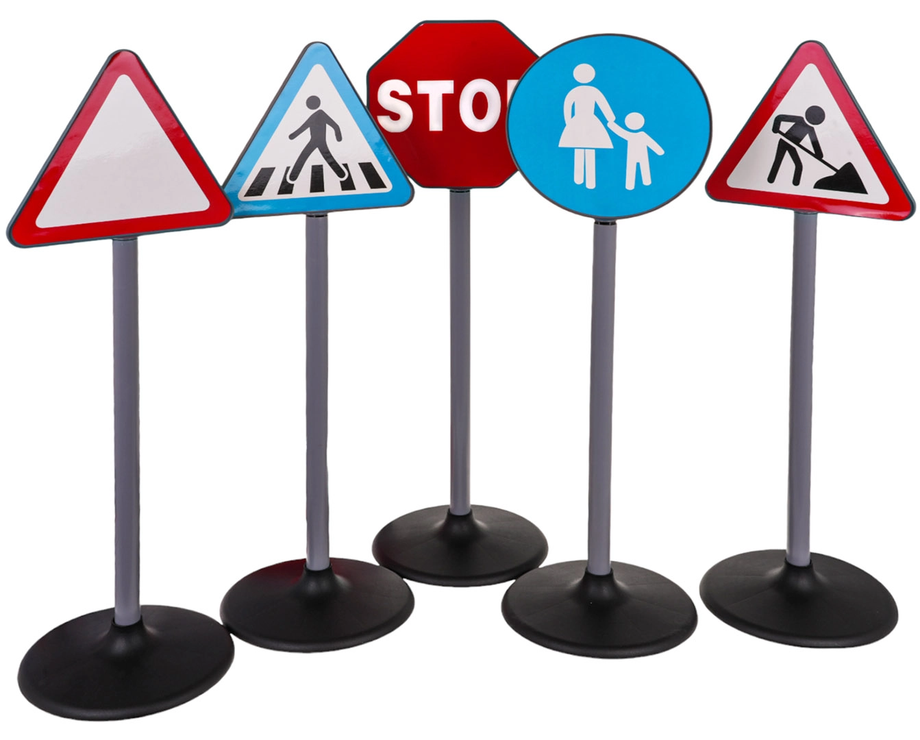 Este juego de señales de tráfico incluye cinco señales diferentes: stop, paso de peatones, triángulo de advertencia, obras en la carretera y acera. Están fabricadas con plástico de alta calidad y diseñadas de forma realista con atención a los detalles. Están dimensionadas en proporción a la altura del niño, lo que las convierte en un juguete educativo ideal para los más pequeños.