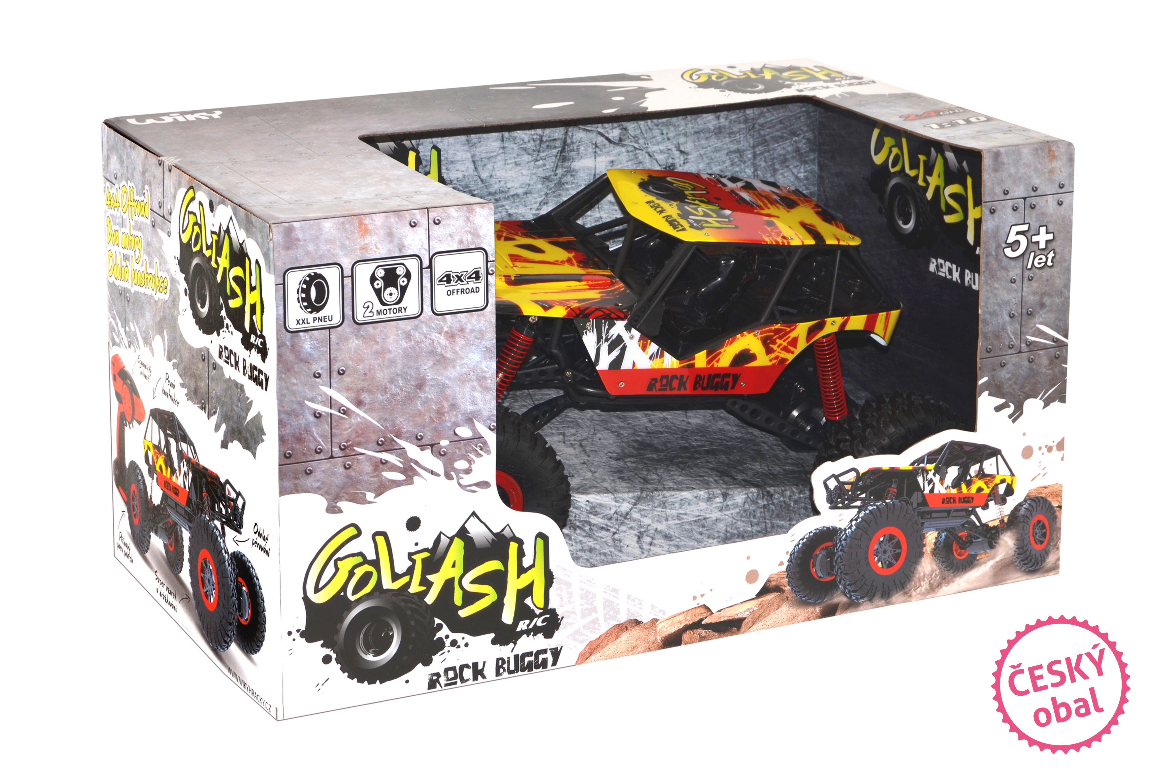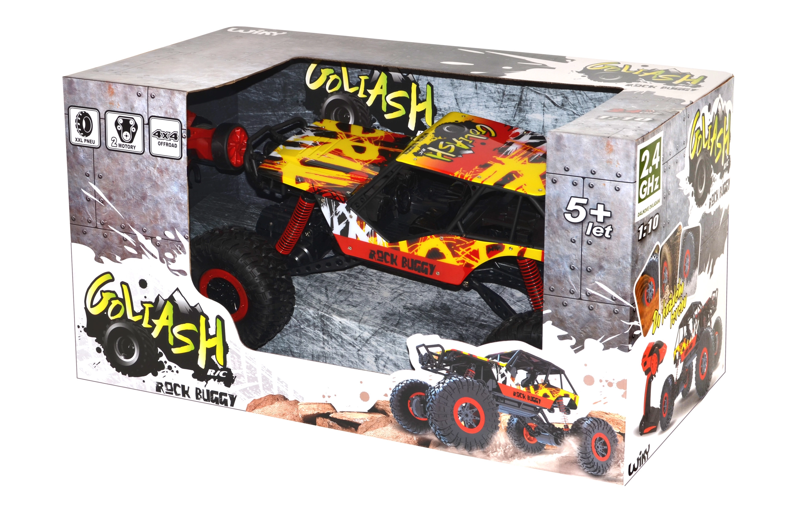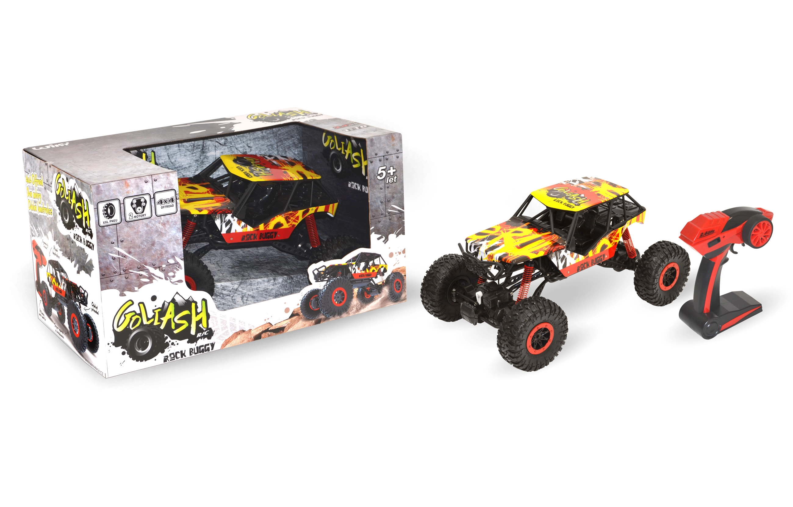 El legendario todoterreno Rock Buggy Goliash está creado para superar obstáculos exigentes. Sus grandes ruedas con super dibujo y ranurado, dos motores y tracción a las cuatro ruedas garantizan una capacidad todoterreno insuperable. Con su robusta suspensión no teme a la hierba, las piedras ni las irregularidades.