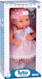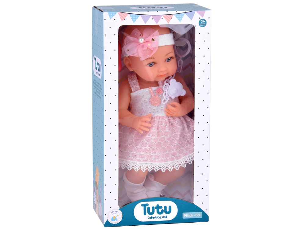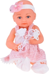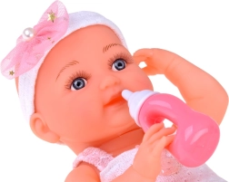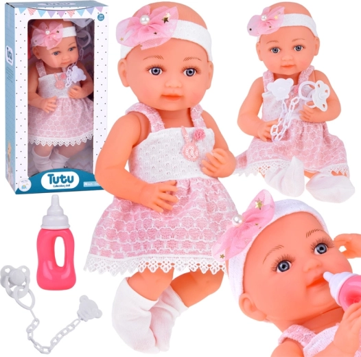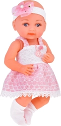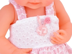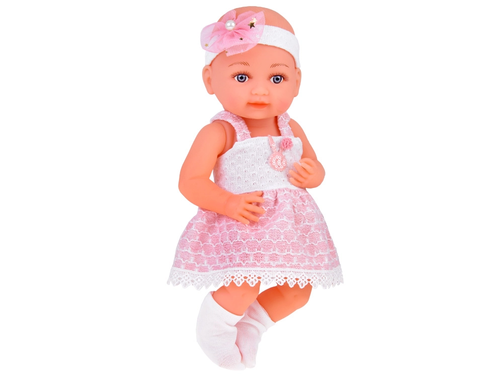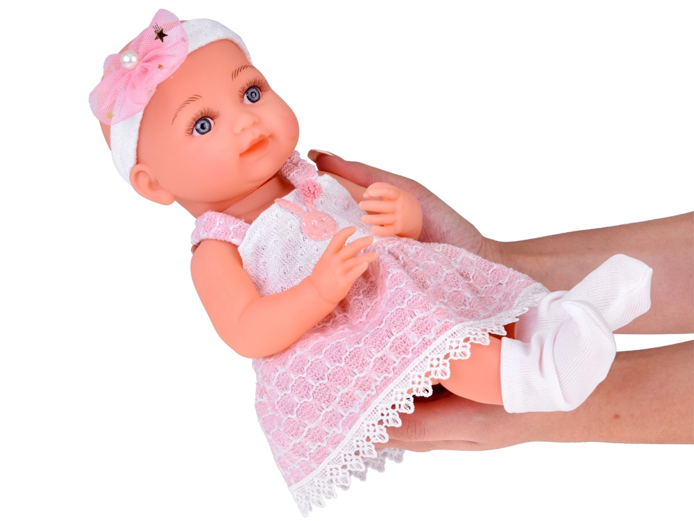 Esta muñeca cuidadosamente elaborada en plástico resistente y textil sorprende con un rostro detallado, expresión delicada y un bonito conjunto en rosa y blanco. El bebé luce una diadema con lazo y perlita y lleva calcetines blancos. Los ojos no se cierran, pero gracias a sus pestañas llamativas resulta muy vivaz.