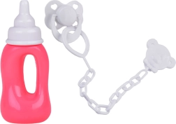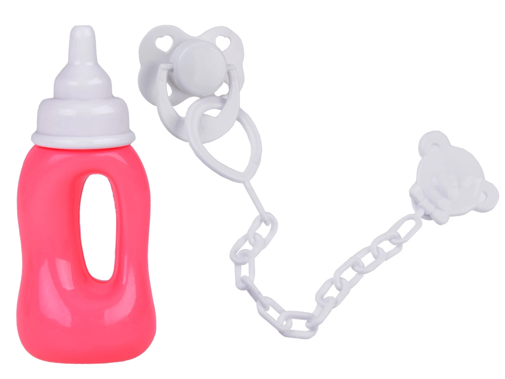 Incluye un biberón rosa y un chupete blanco con cadena y clip: accesorios que fomentan un cuidado realista.