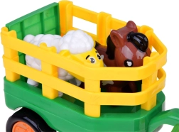 El remolque amarillo y verde se abre para facilitar la carga y descarga. Los niños pueden transportar el caballo y la oveja y crear sus propias historias de granja.