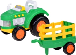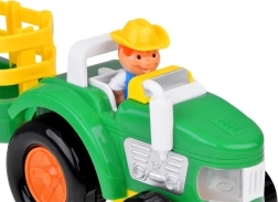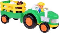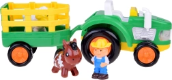 Divertido tractor infantil con remolque y figuras que ofrece sonidos de motor y de alarma, faros delanteros luminosos, remolque abatible y ruedas móviles. Incluye figuras de granjero, caballo y oveja; un juguete ideal para pequeños amantes de la granja a partir de 3 años.
