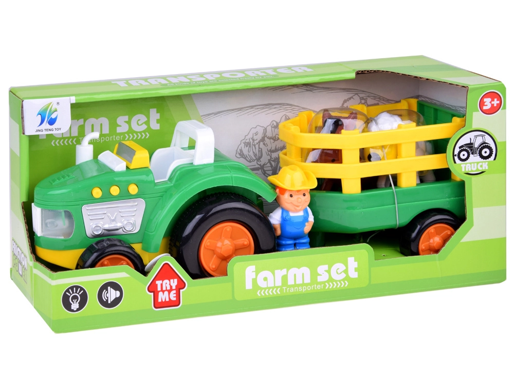 En la caja encontrarás: tractor, remolque, figura del granjero, oveja y caballo. Alimentación: 3× AG13 (no incluidas).