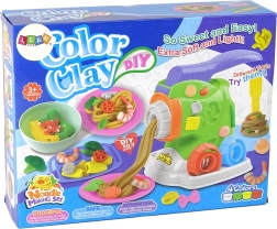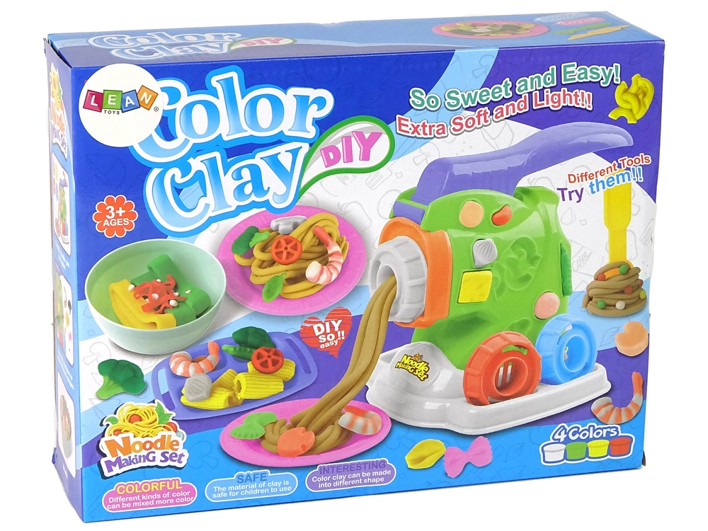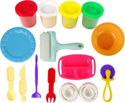 El set incluye cuatro botes de plastilina en colores blanco, rojo, verde y amarillo, un práctico rodillo, cuchillito y espátula para dar forma, cuenco y platito. La textura de la masa recuerda a la pasta real, de modo que los niños pueden experimentar sin desperdiciar comida y los padres sin preocuparse por el desorden.
