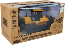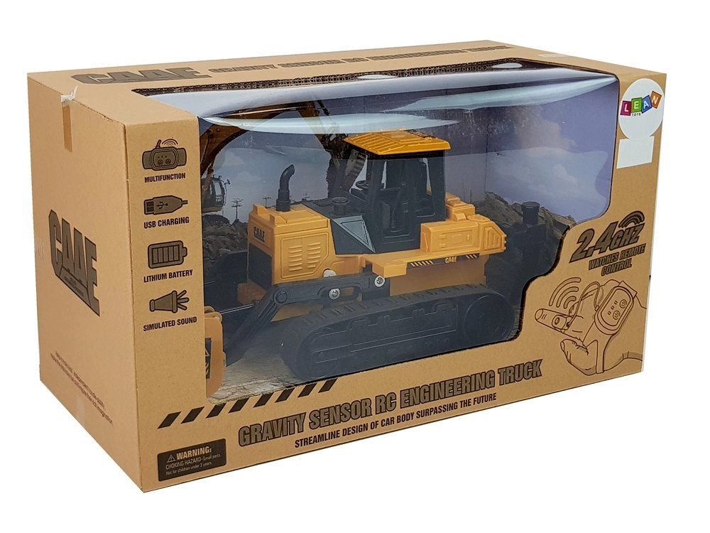 Divertido y realista bulldozer RC con orugas a escala 1:28 que ofrece control por gestos de la mano mediante pulsera, 6 funciones por canal, carga por USB y sonidos de obra. Ideal para pequeños técnicos: desarrolla habilidades manuales, concentración y pensamiento lógico.
