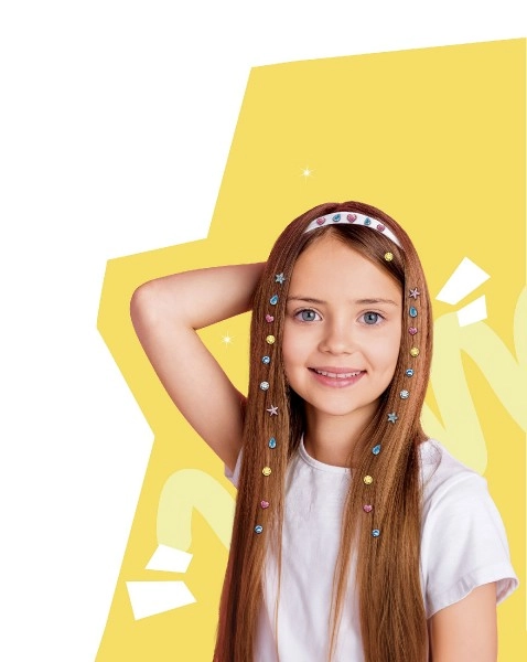 Contenido del paquete: aplicador, 80 piezas de piedritas brillantes, accesorios. Recomendado para niños a partir de 5 años, con la supervisión de un adulto cuando se utilice en el cabello.