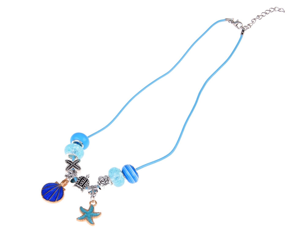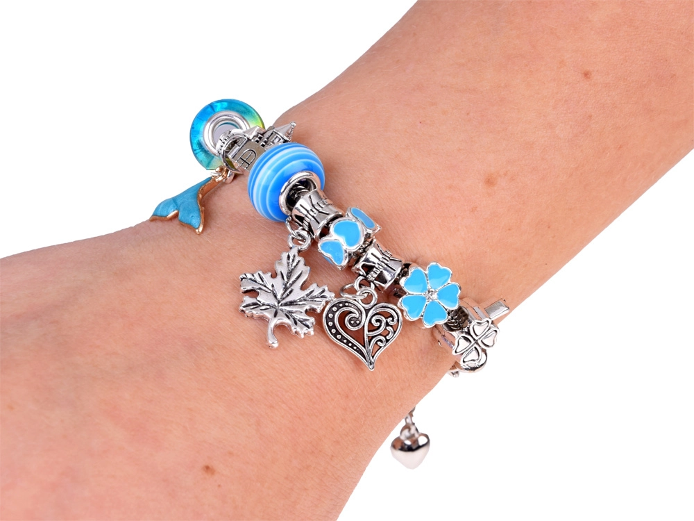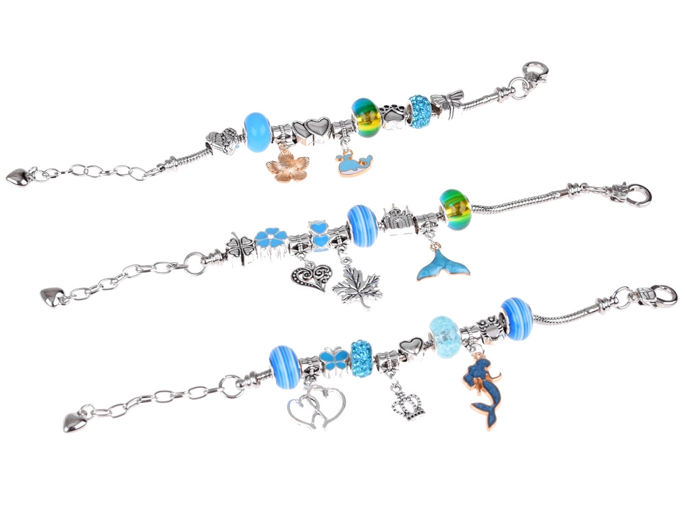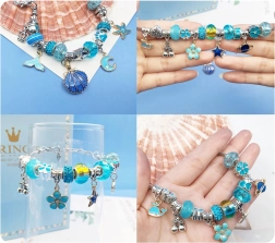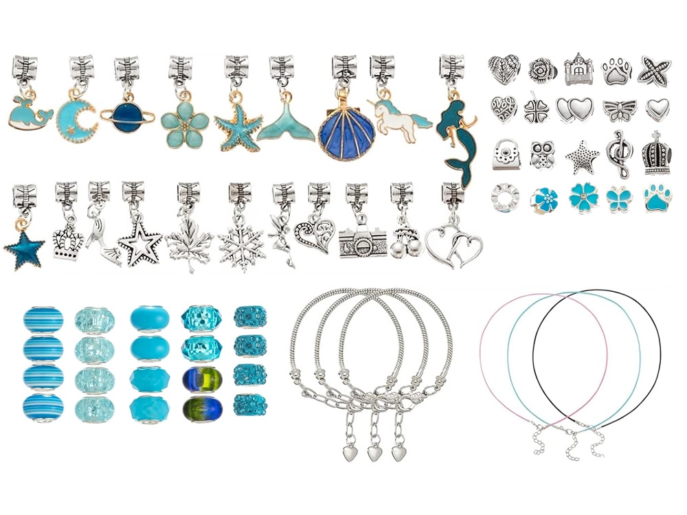 Cuentas, colgantes y cadenas en tonos plateado‑azul con motivos marinos, florales y de corazones: infinitas posibilidades de combinación.