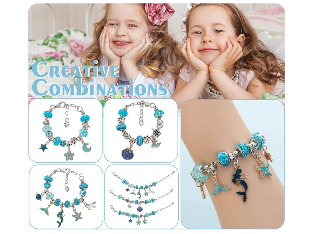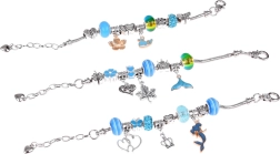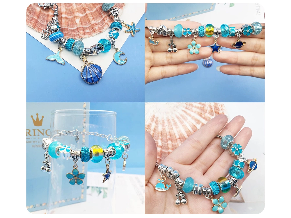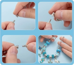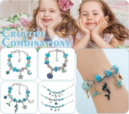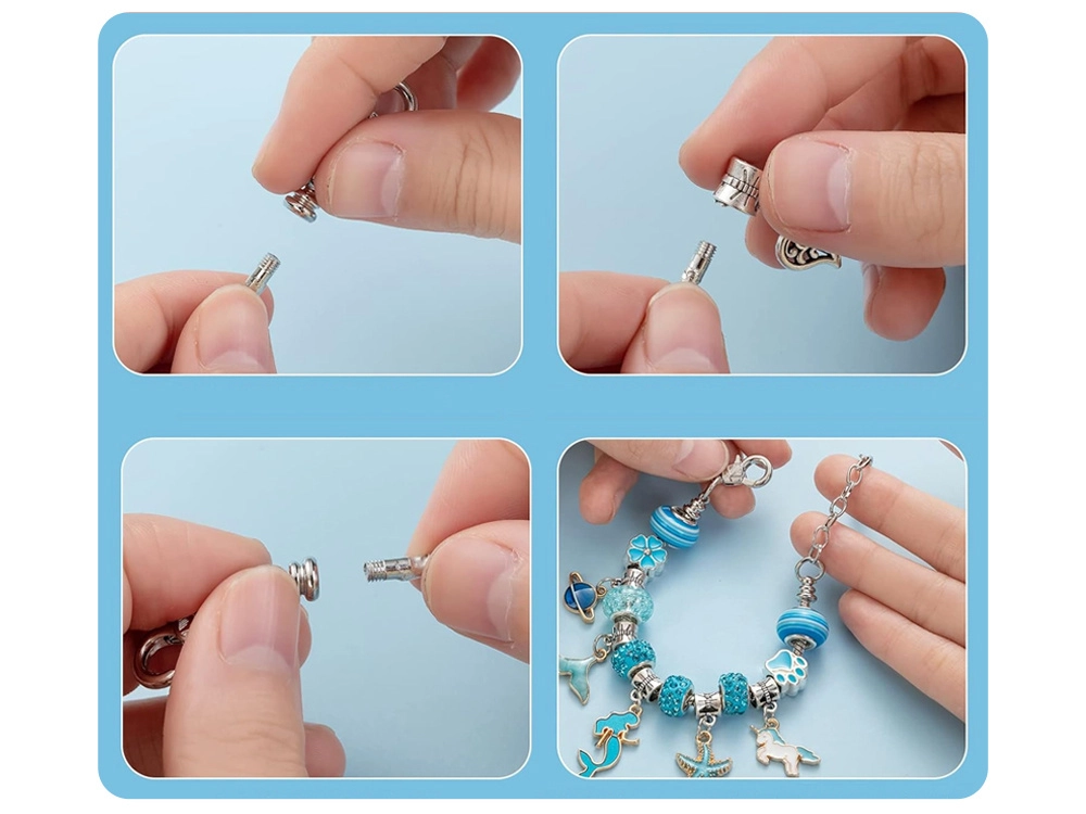 Este set creativo ofrece una amplia selección de componentes para ensartar y componer tus propios accesorios con facilidad. Pulseras metálicas, cadenas ajustables y cordones encerados, complementados con cuentas decorativas y charms colgantes, permiten crear joyas exactamente como las imaginas: desde motivos marinos hasta corazones y flores.