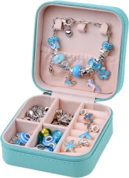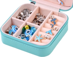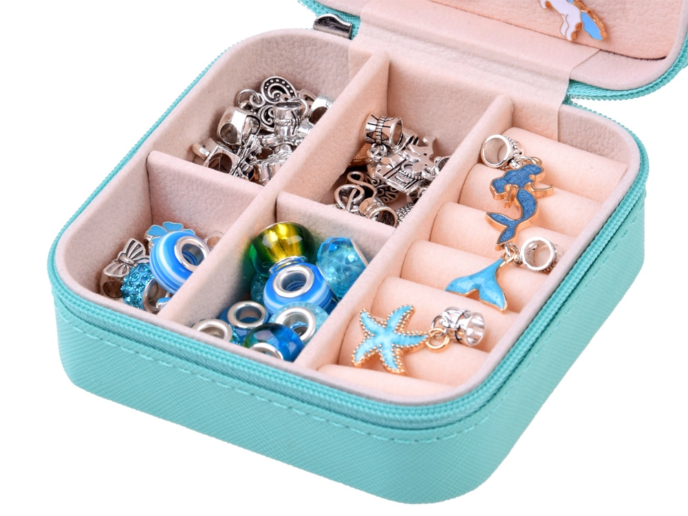 Los compartimentos acolchados protegen las cuentas, los colgantes y las pulseras terminadas. Ideal para la habitación infantil y para viajes.
