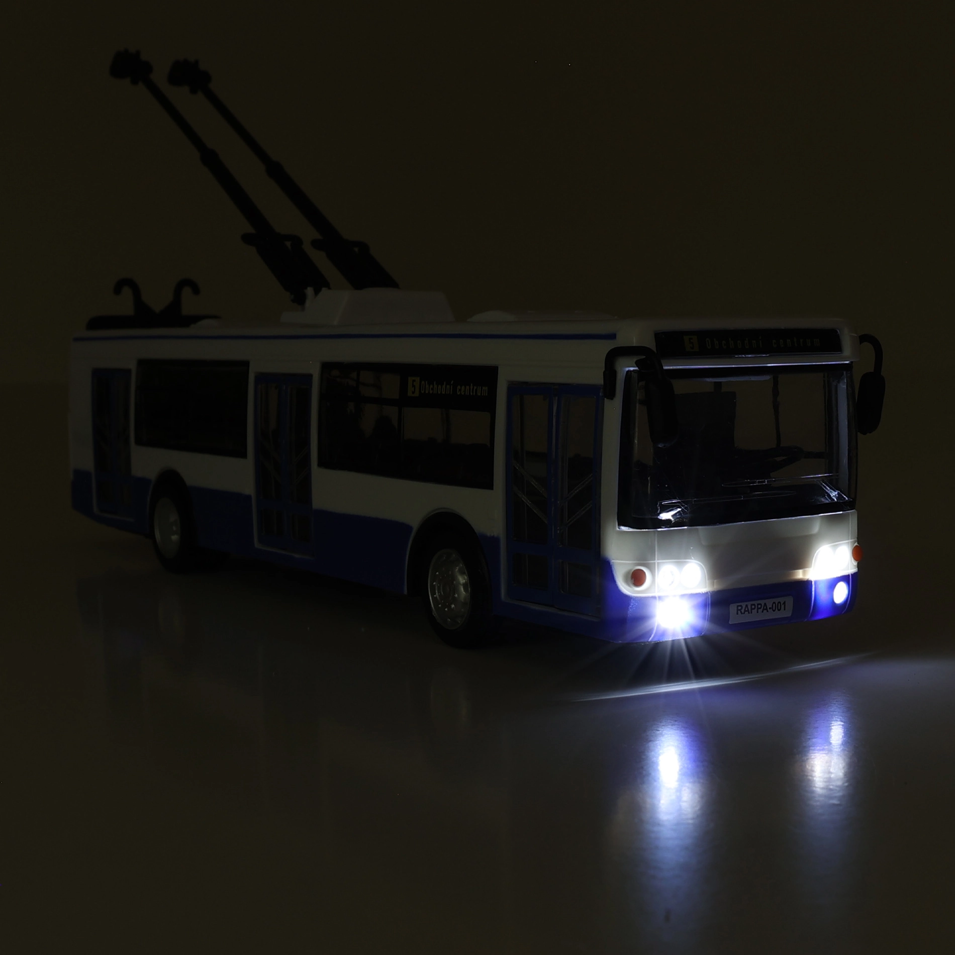 ¡Rápido, sube, cierra las puertas y nos vamos! Este trolebús realista de 28 cm a escala 1:43 anuncia las paradas en checo y cuenta con mecanismo de retroceso. Las puertas abatibles se pueden manejar manualmente; el cierre automático con botón en el techo va acompañado de luces delanteras intermitentes y anuncios en checo. Las pilas están incluidas en el paquete: un regalo ideal para pequeños conductores y fans del transporte ecológico.