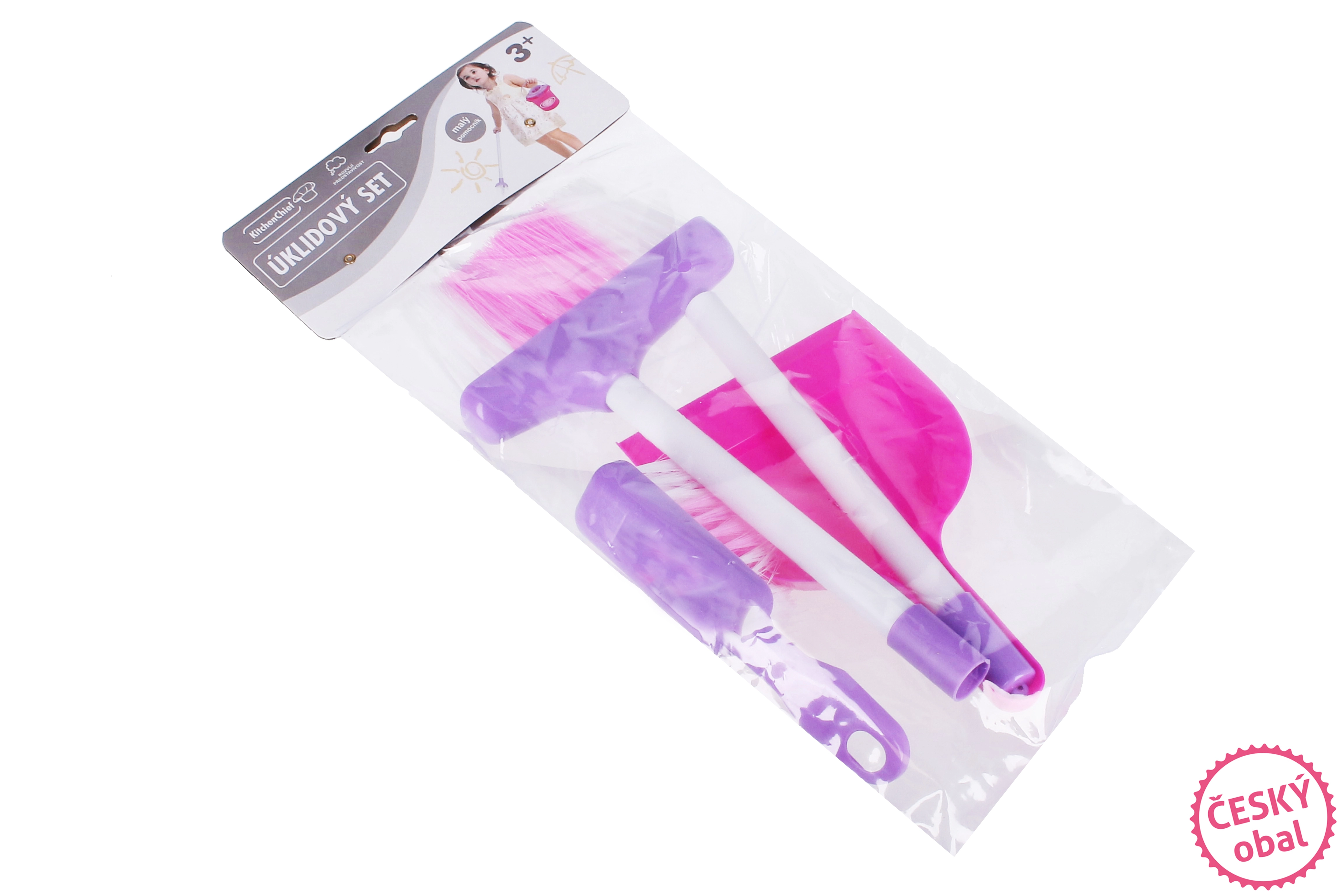 Práctico juego de limpieza infantil compuesto por 3 piezas: recogedor, cepillo de mano y escoba plegable. Fabricado en plástico resistente en color rosa y blanco, ideal para jugar a las tareas del hogar y desarrollar la motricidad fina. La escoba plegable cabe fácilmente en una caja de juguetes pequeña.