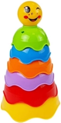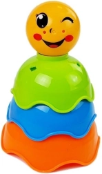 La pirámide de juego en colores del arcoíris hecha de vasos apilables apoya el desarrollo del niño desde los primeros meses. Los vasos de plástico de alta calidad y seguro tienen bordes lisos y redondeados, y en la parte superior hay el vaso más pequeño con una carita alegre. El juguete desarrolla la motricidad fina, la coordinación mano-ojo, el reconocimiento de colores y formas y el pensamiento lógico.
