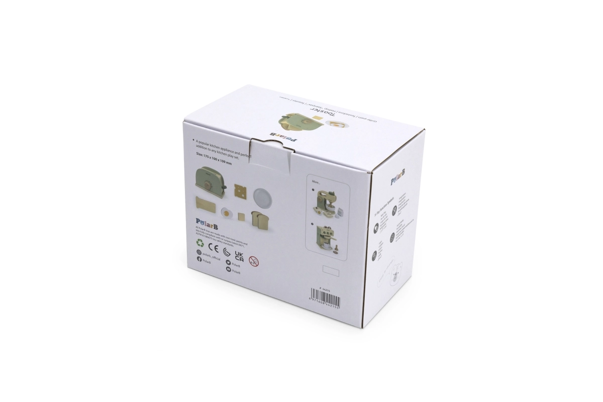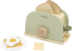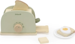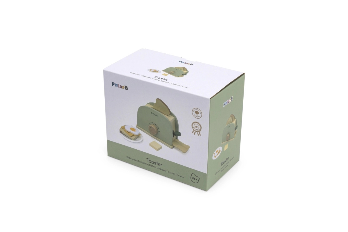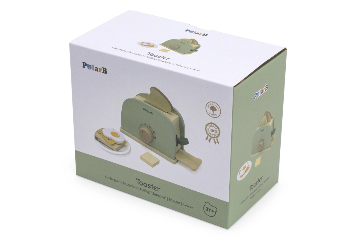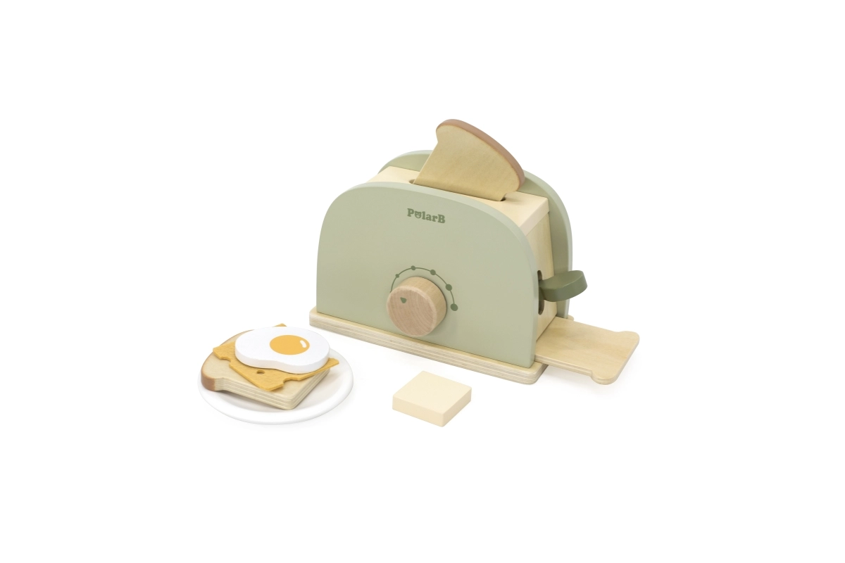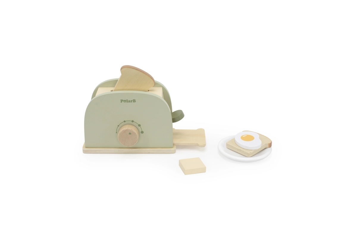 Una tostadora verde de madera y con estilo de la serie PolarB, ideal para el juego creativo de cocina. Favorece el desarrollo de habilidades cognitivas y manuales, la creatividad y la imaginación. ¡Un complemento excelente para la cocina infantil!