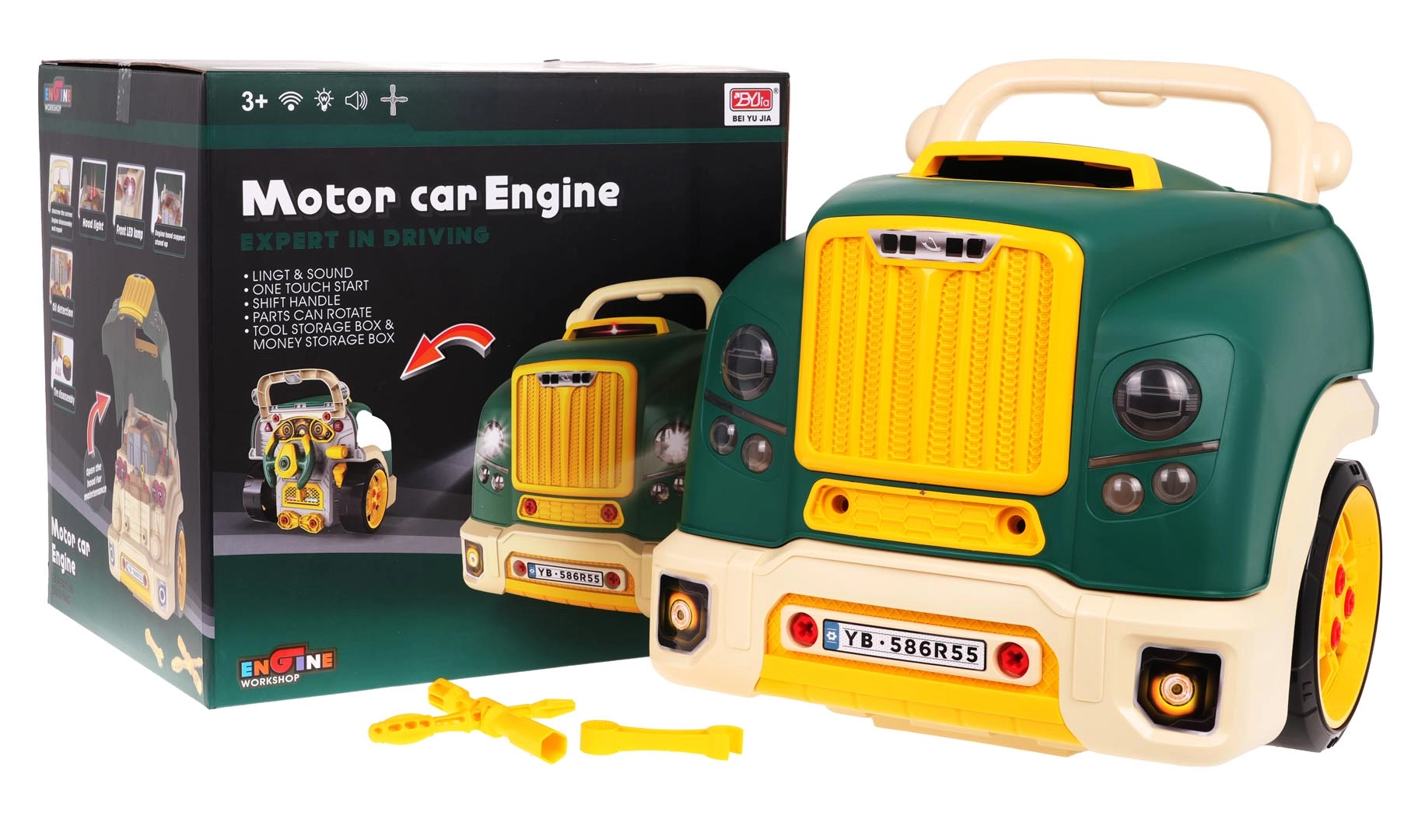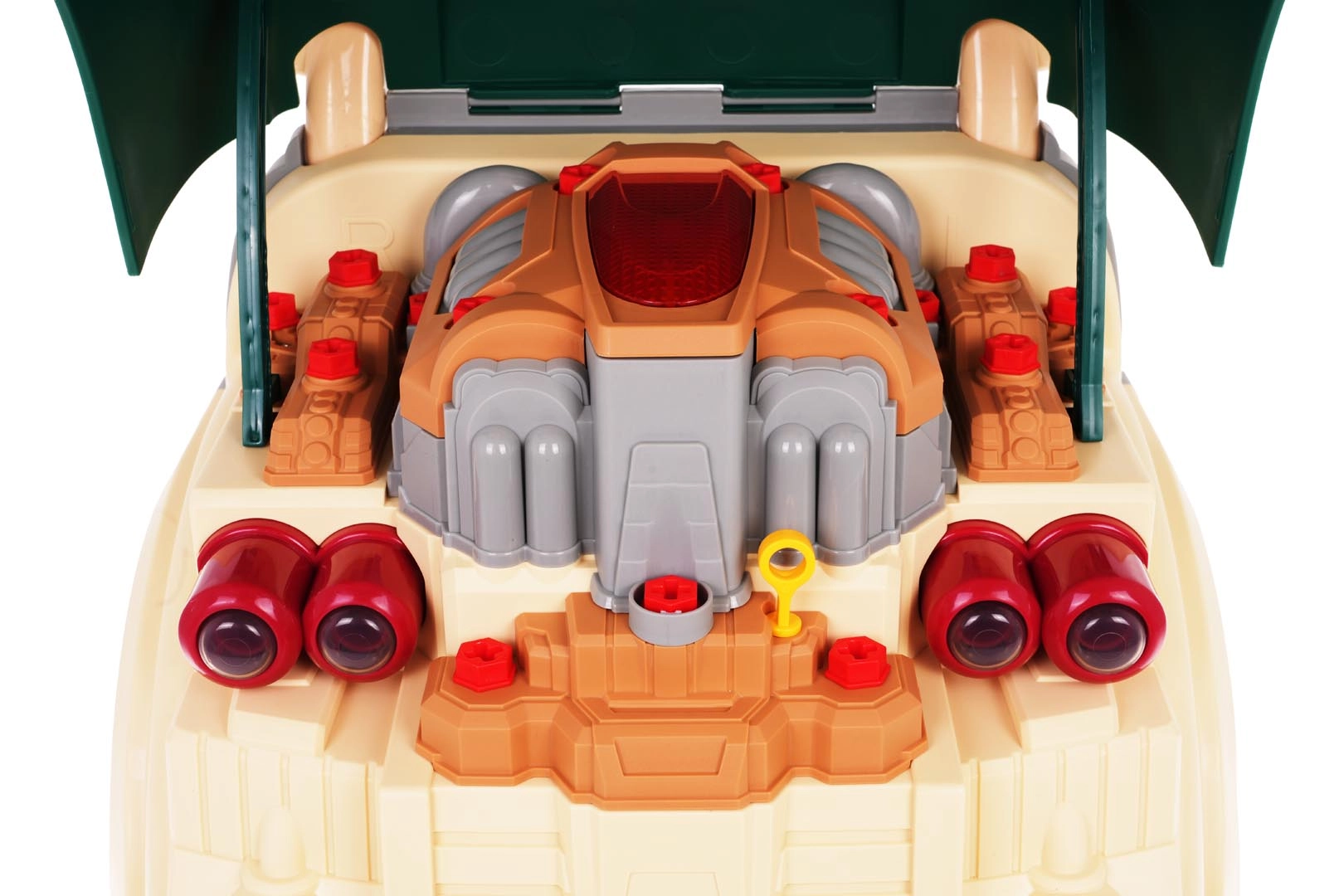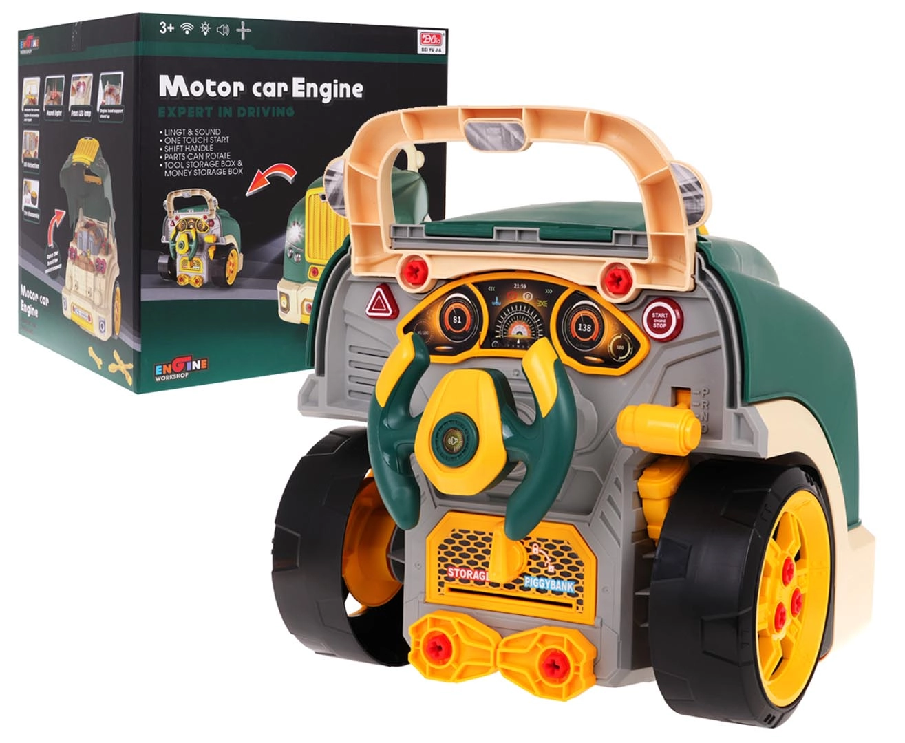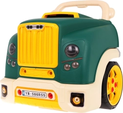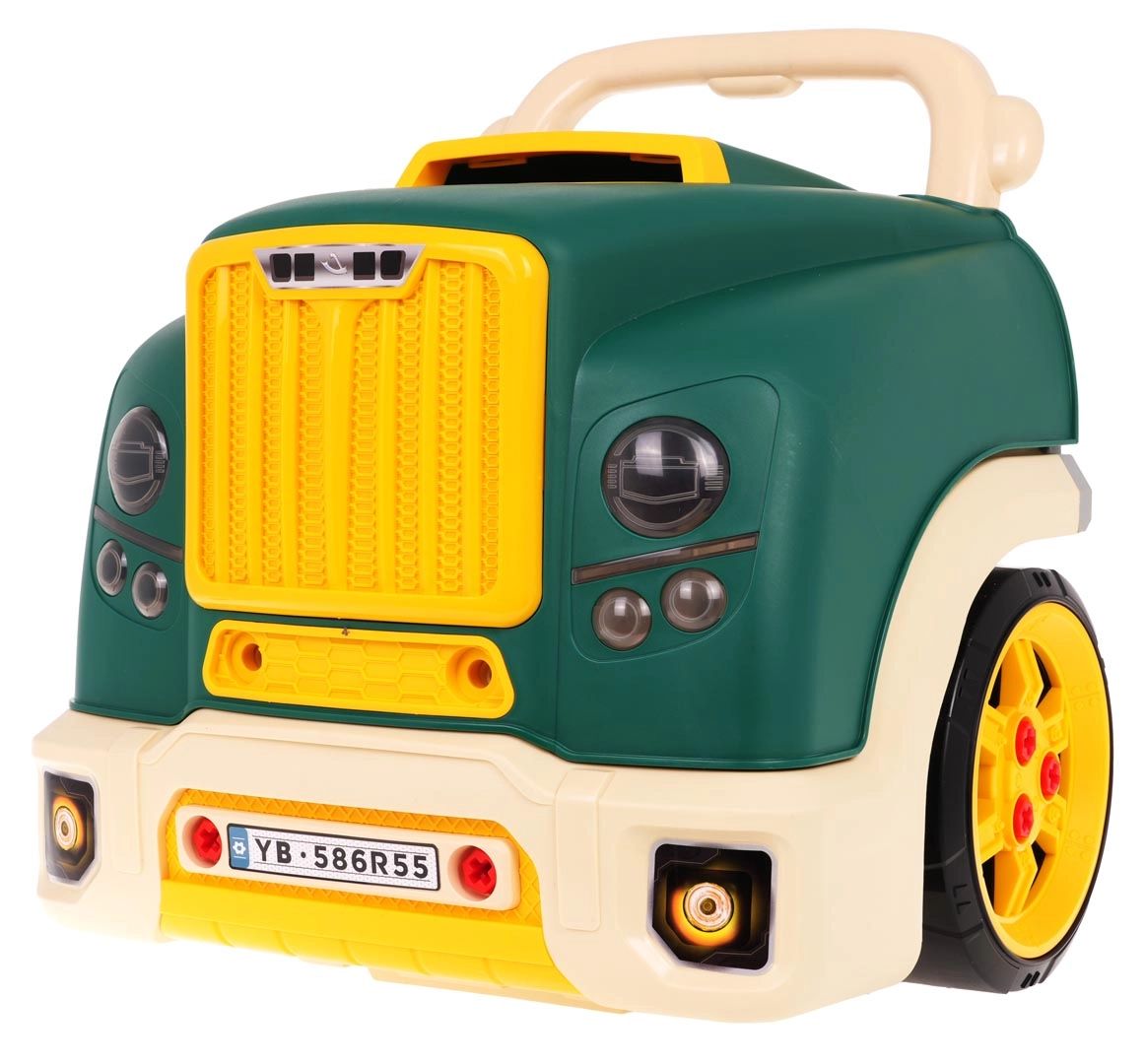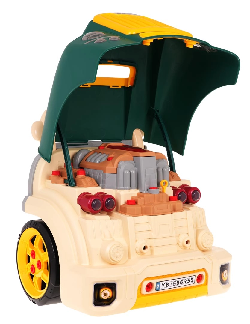 Esta parte frontal de camión en color verde con capó abatible ofrece una diversión interactiva muy completa: motor desmontable, faros que se encienden y sonidos auténticos de arranque, conducción y marcha atrás. En el tablero encontrarás el botón de encendido, volante con claxon, señal de advertencia y palanca de cambios. Bajo el volante hay un práctico compartimento para herramientas y tornillos, y no falta un cómodo asa para facilitar el transporte.