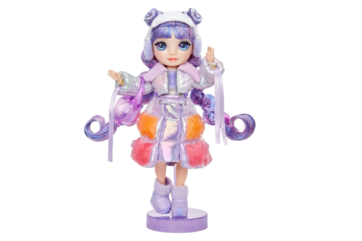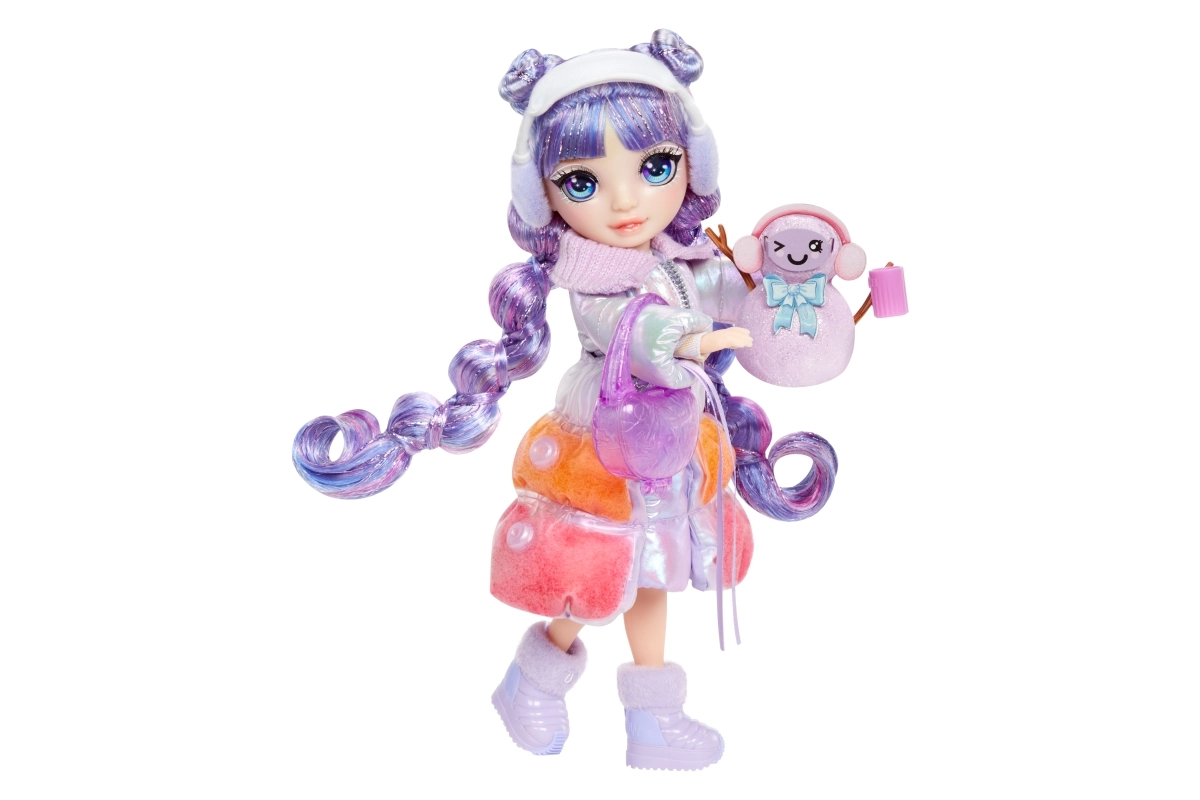 La divertida edición invernal de RAINBOW HIGH trae a la bella violeta Violet Willow, que gracias a la nieve mágica vive una transformación instantánea de su outfit. En la caja encontrarás montones de accesorios, un soporte y un cepillo, así como un set para crear un muñeco de nieve. Muñeca totalmente articulada de 28 cm para juegos de moda e invierno sin fin.