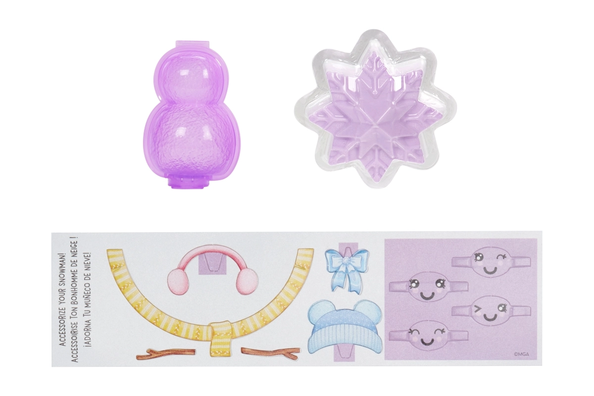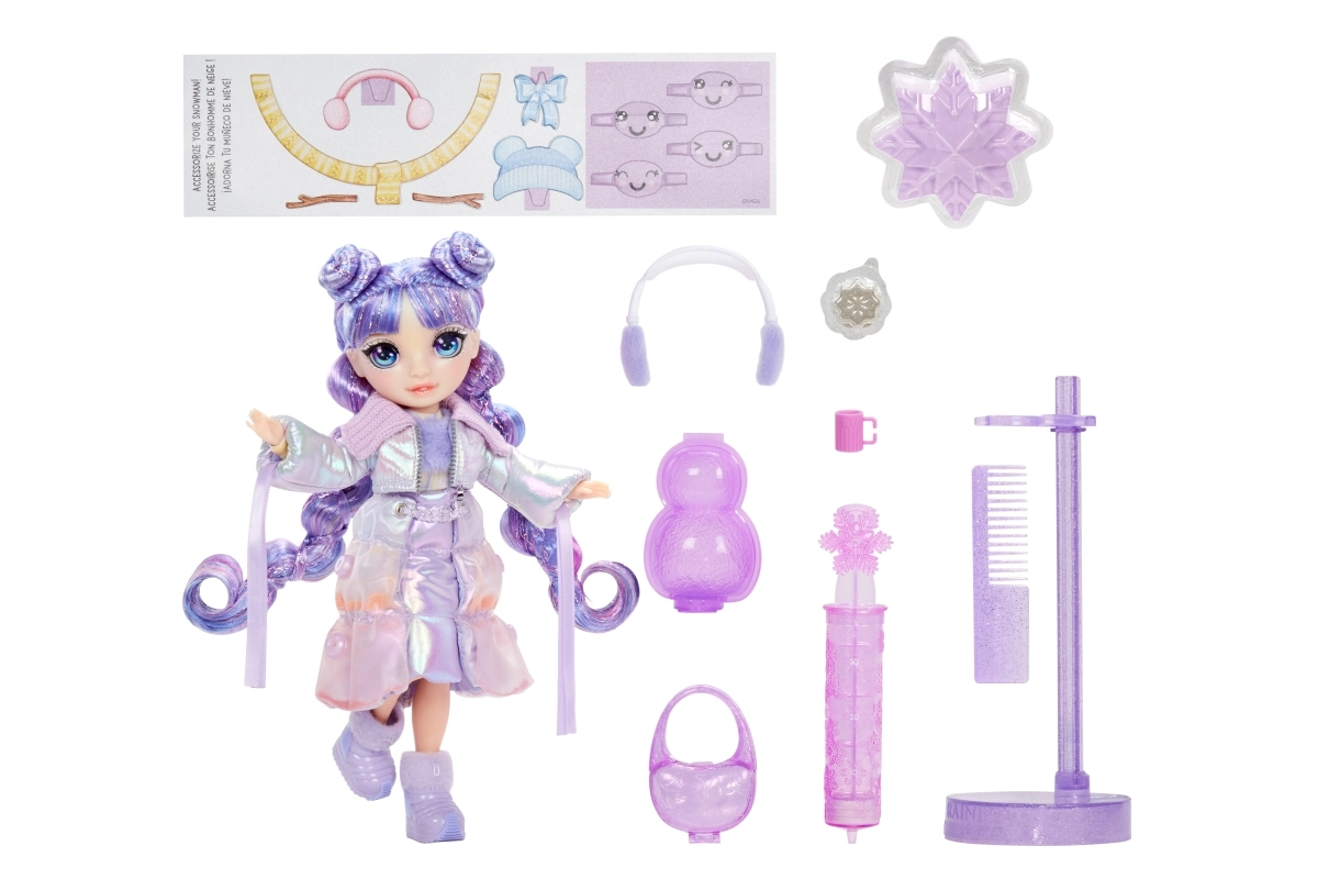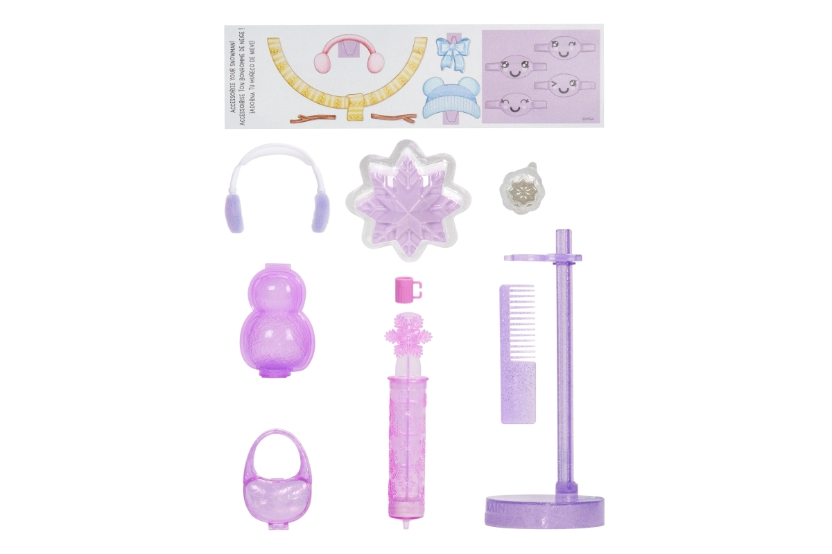 En el paquete también encontrarás accesorios invernales para estilizar y fotografiar, un práctico soporte para exhibir, un cepillo para el cabello y un set creativo para crear tu propio muñeco de nieve con “nieve” moldeable. La muñeca totalmente articulada se posa con facilidad y, con su look violeta, ilumina cualquier colección.