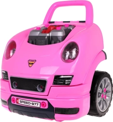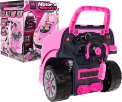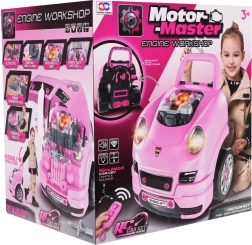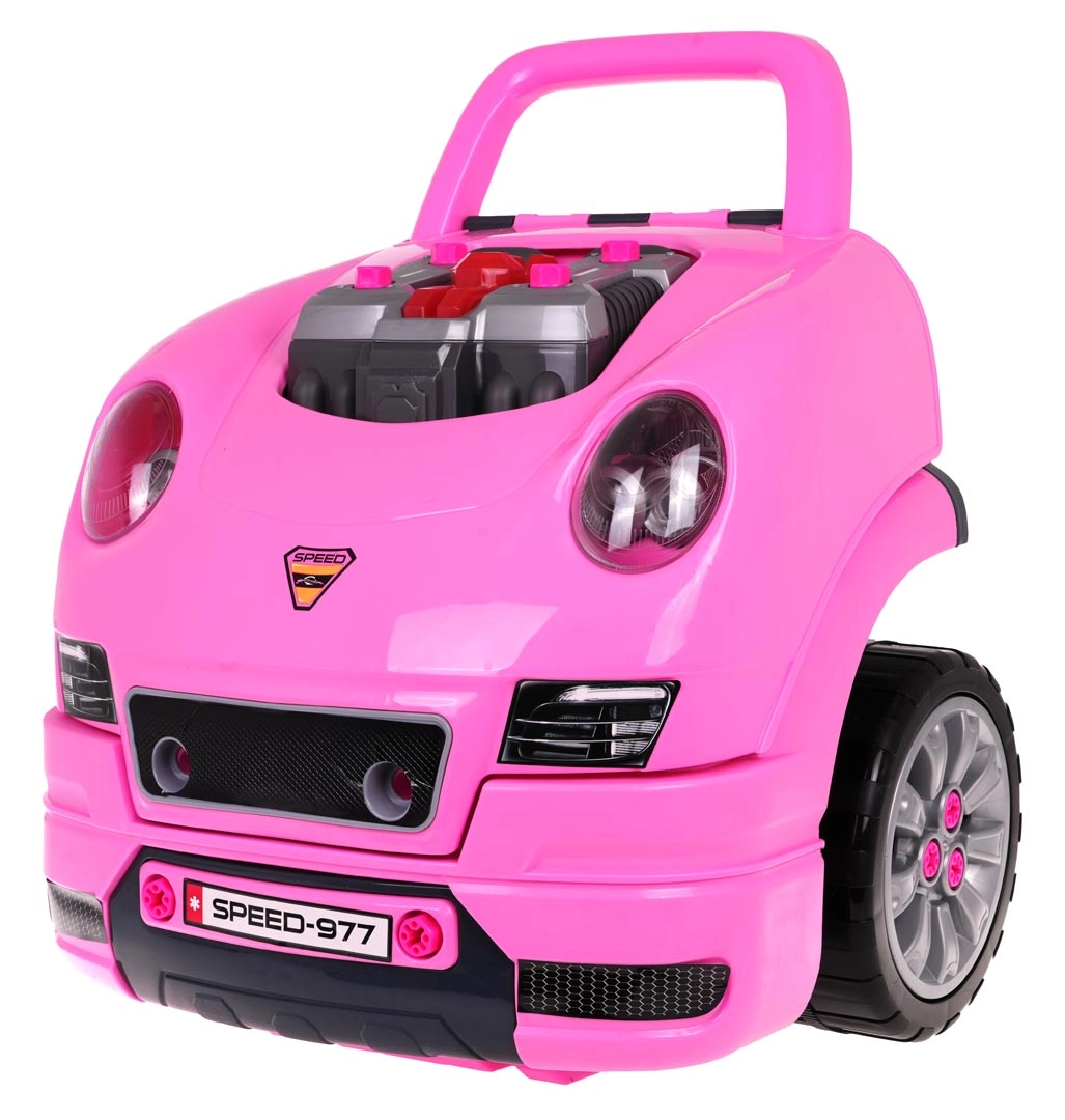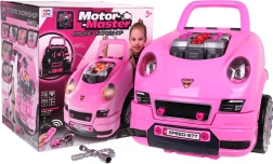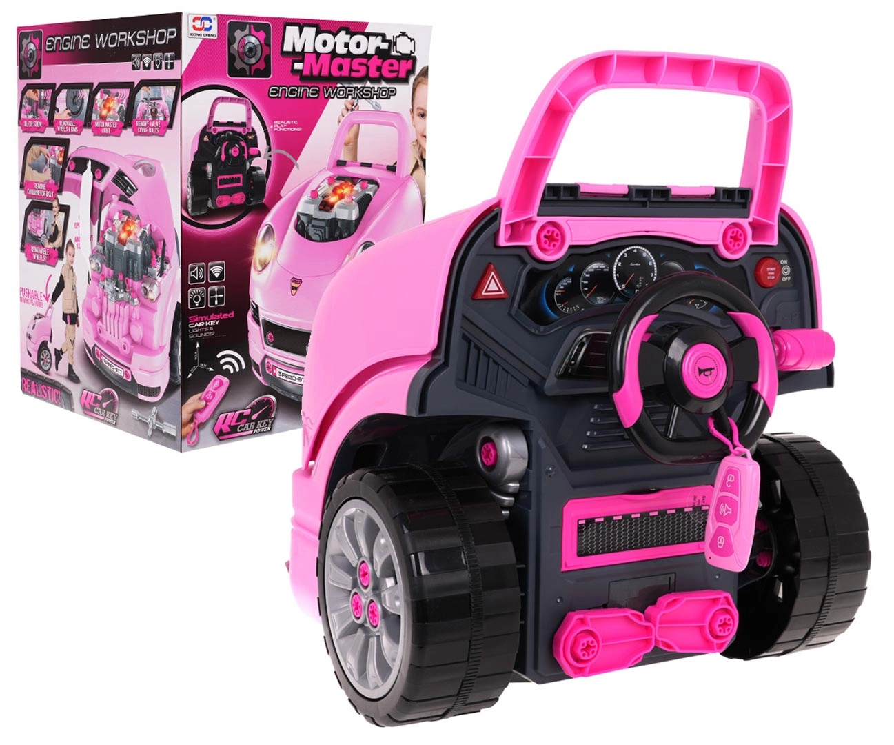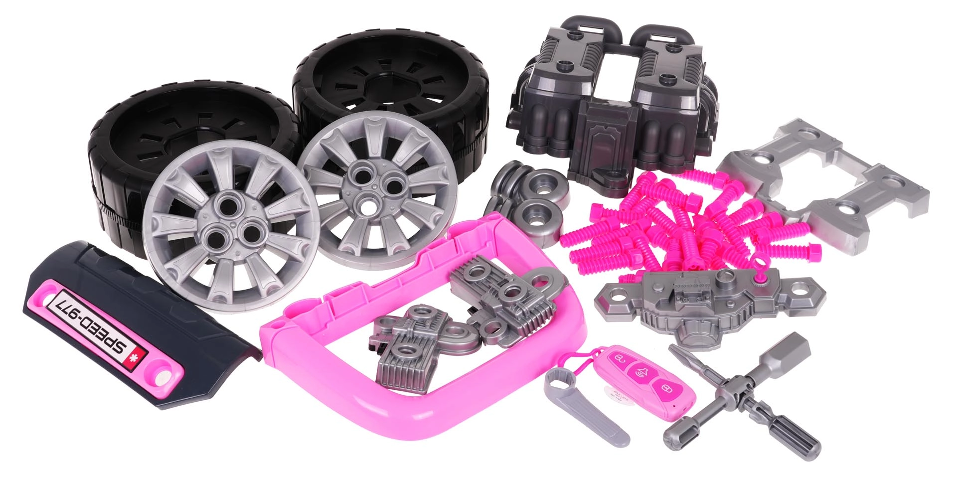 El mando a distancia en forma de llaves activa los faros delanteros iluminados y la iluminación del motor, así como los sonidos de bloqueo/desbloqueo o el claxon. El asa práctica facilita el transporte y el compartimento bajo el volante guarda todos los tornillos, herramientas y accesorios. El set desarrolla habilidades, imaginación y enseña los fundamentos de la mecánica de forma divertida.