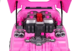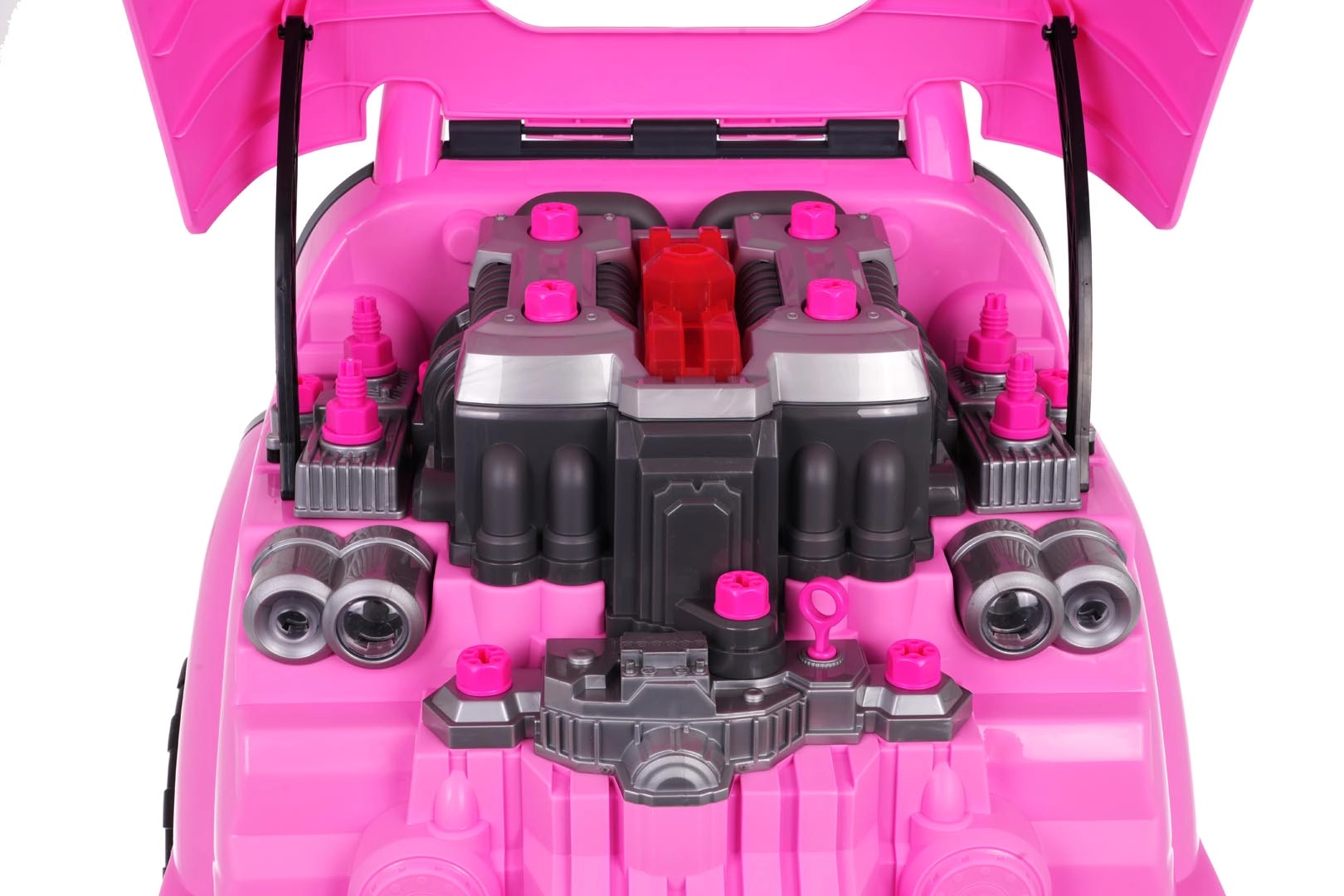 La parte delantera interactiva del vehículo, con cuadro de instrumentos y palanca de “cambios” automática, ofrece a los niños una experiencia realista tanto de conducción como de servicio. Al pulsar el arranque suena el motor en marcha; durante la conducción y la marcha atrás se activan los efectos correspondientes. Bajo el capó se esconde un gran motor desmontable donde los pequeños mecánicos pueden cambiar las “bujías”, las ruedas y otros componentes.
