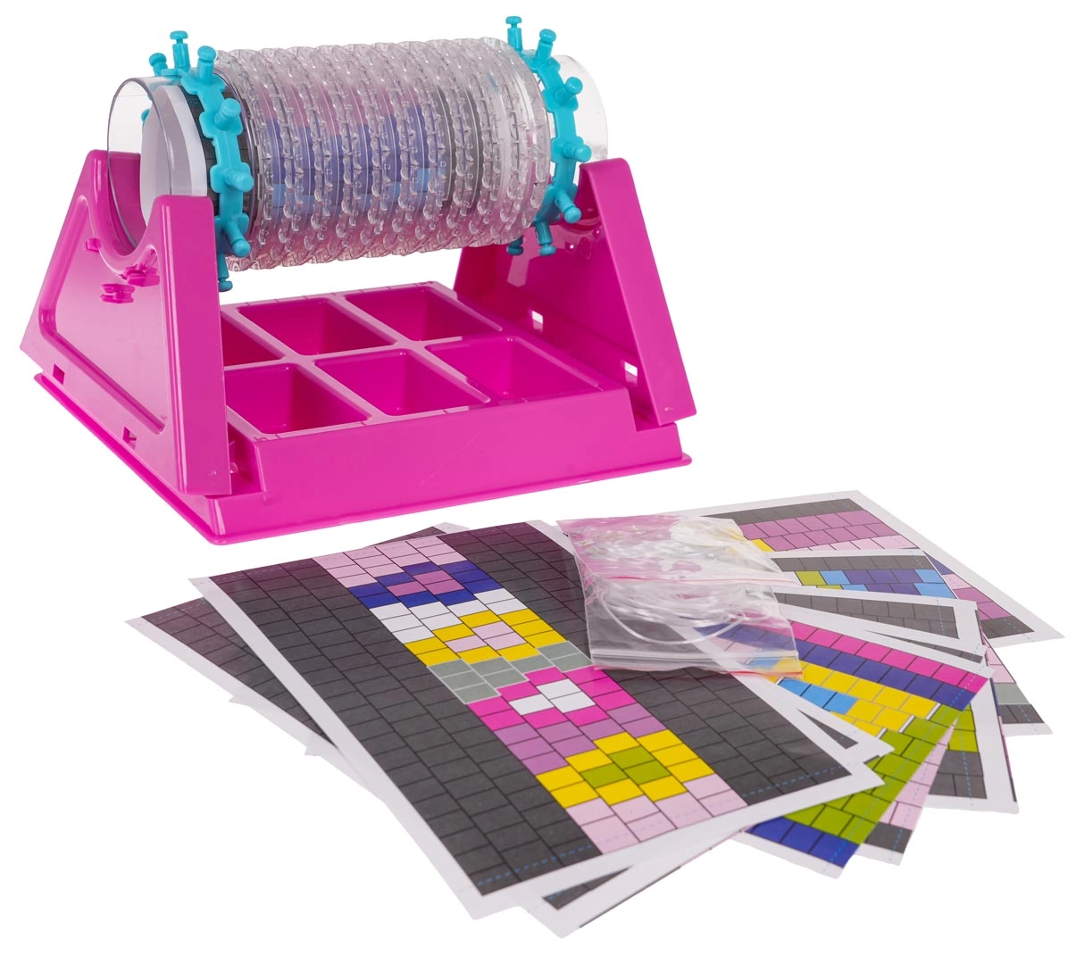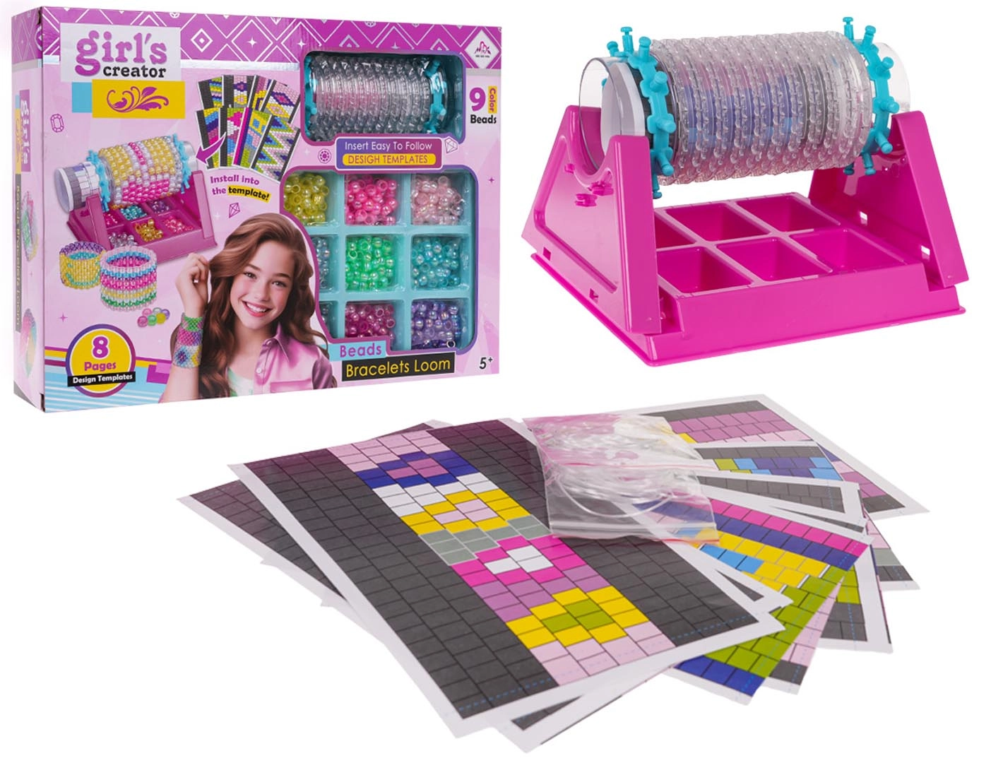 Este set completo permite a los niños crear pulseras originales de forma fácil y entretenida. Basta con colocar el tubo de plástico en la base, verter las cuentas en compartimentos organizados, elegir un patrón de la plantilla o crear según su propia imaginación y empezar a tejer de derecha a izquierda. El set es colorido, intuitivo e ideal para los primeros pasos en las labores manuales.