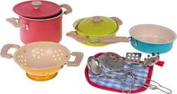 Este colorido set de vajilla infantil lleva una experiencia de cocina auténtica a cualquier cocinita de niños. Dos ollas con tapas, una sartén, un colador y cuatro prácticos utensilios de cocina ofrecen todo lo que necesitan para imitar la cocina real. Gracias a los materiales metálicos, el set es robusto, duradero y listo para el juego diario.