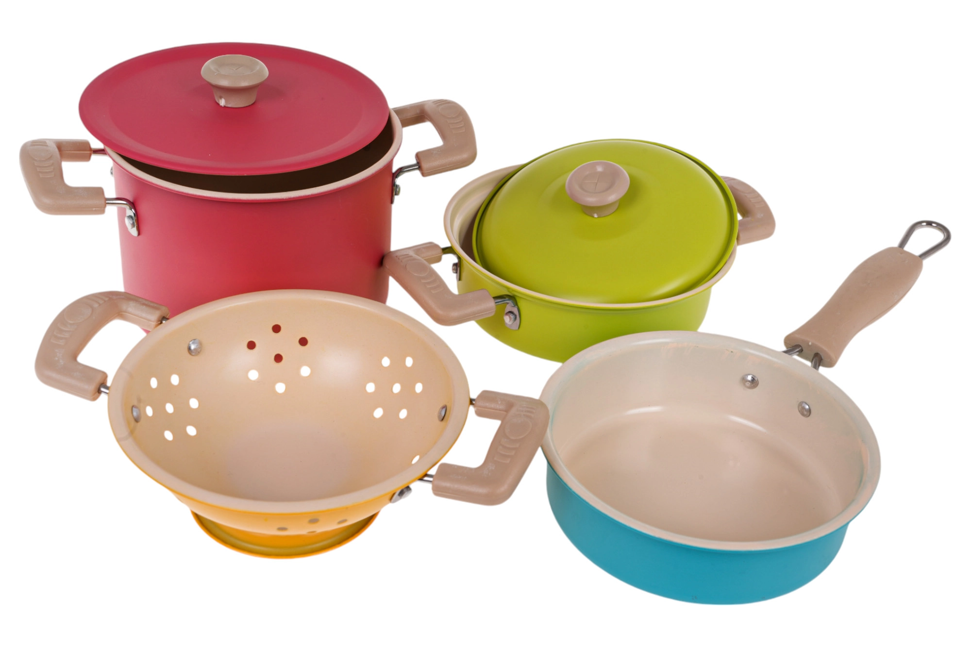 - Olla roja con tapa: aprox. 14,5 × 7,5 cm; olla verde con tapa: aprox. 14,5 × 4,5 cm; colador: aprox. 14,5 × 4 cm; sartén azul: aprox. 20 × 10 × 3 cm