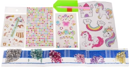 El set incluye pegatinas de unicornios, gemas brillantes y plantillas. Los niños crean un diseño original y desarrollan la motricidad fina y la creatividad.