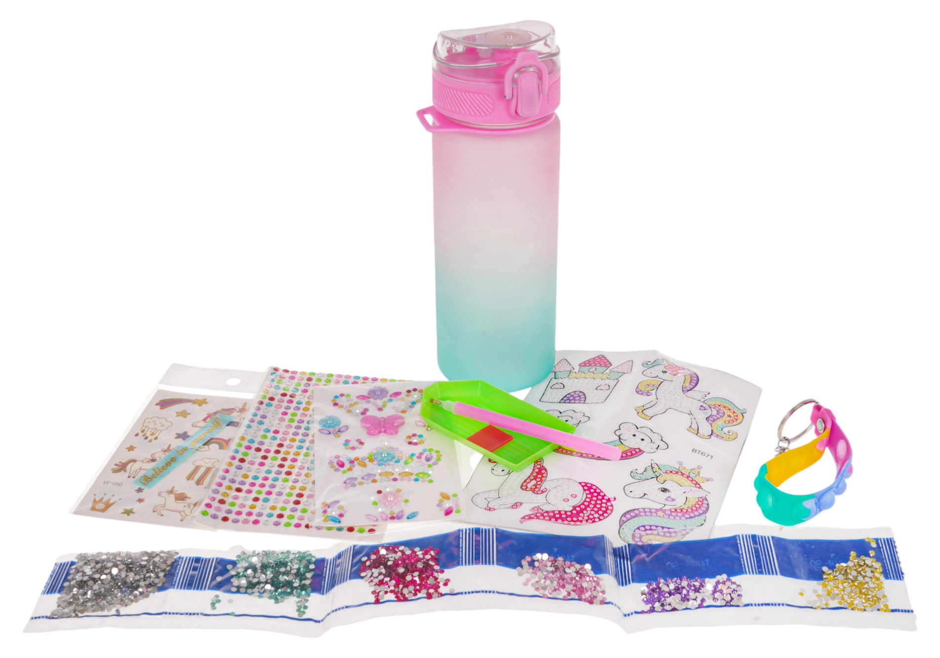 - botella, correa, bolígrafo para gemas, bandeja de plástico, cuadrado adhesivo, 6 bolsas con gemas, hoja de unicornios, hoja de gemas (408 uds), hoja con composición floral, hoja con plantillas, pegatina con texto