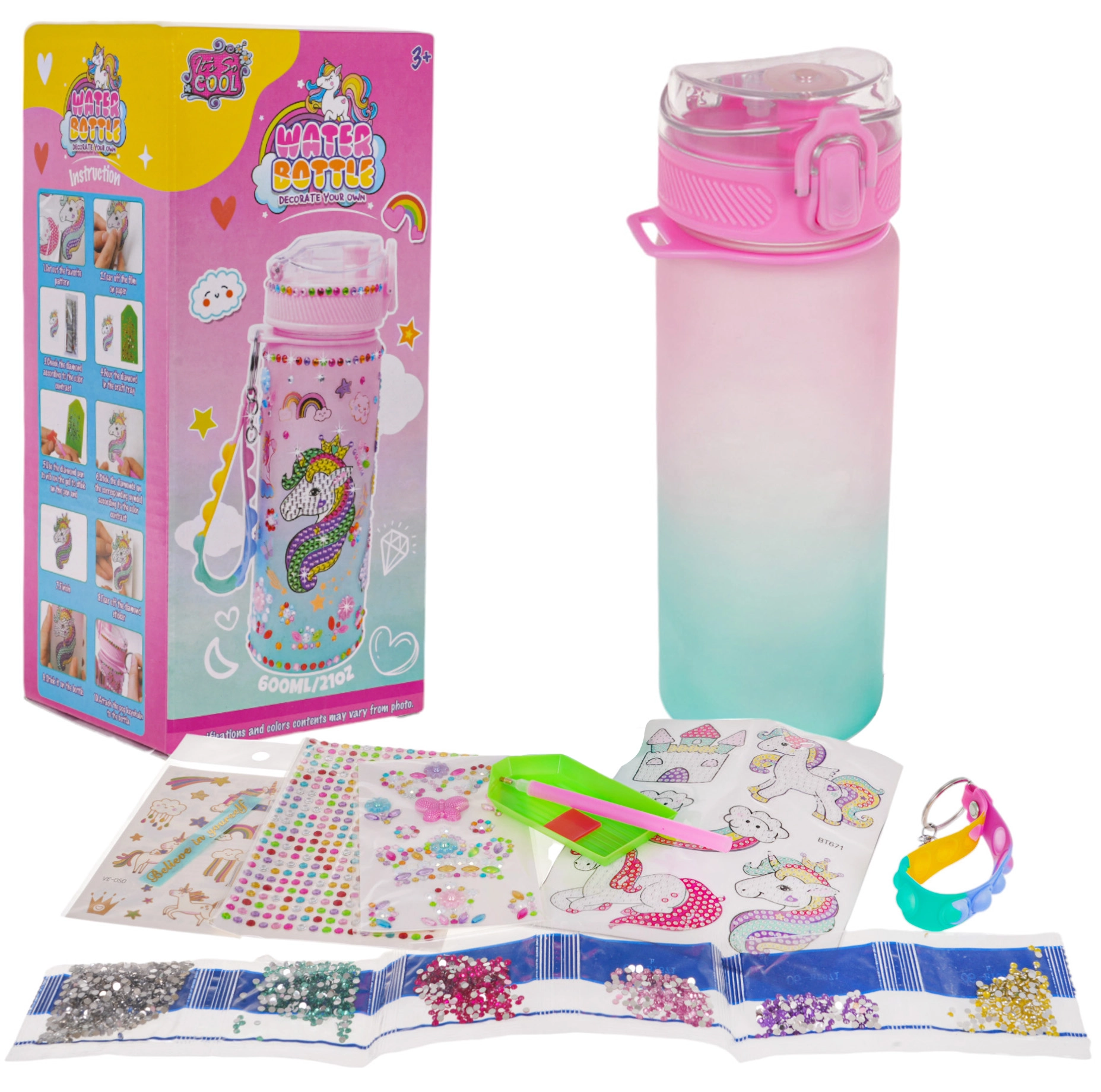 El material de la botella es sin BPA y apto para niños. En el paquete también encontrarás un asa/correa para llevarla cómodamente, una herramienta para aplicar las gemas y plantillas claras. Una excelente idea de regalo para pequeños amantes de los unicornios.