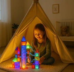 Descubre un set de construcción creativo para niños a partir de 3 años: bloques magnéticos y tubos transparentes para construir circuitos de canicas con efectos luminosos. El set de 134 piezas incluye elementos LED, proyector de estrellas, focos e incluso un ascensor motorizado para canicas. Desarrolla la motricidad fina, la orientación espacial y la creatividad: diversión y aprendizaje en uno.