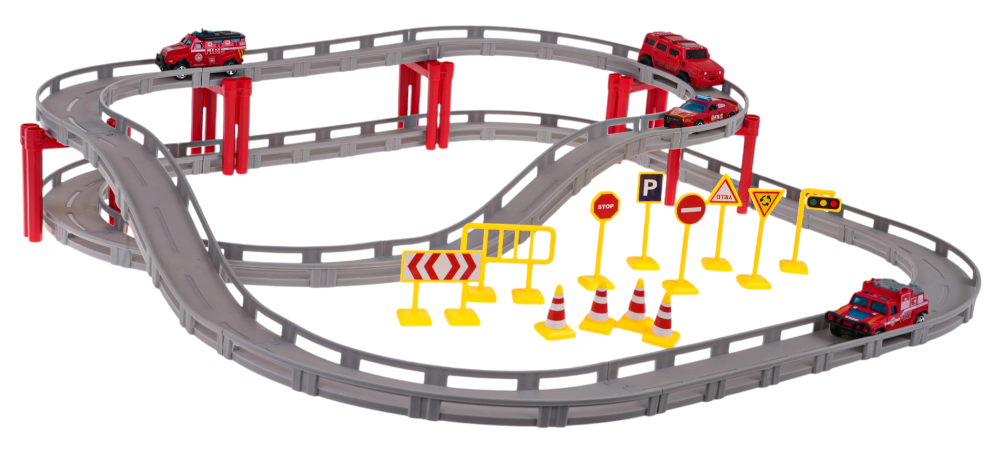 La pista de carreras versión Bomberos está diseñada para niños a partir de 3 años. Esta pista única incluye 35 elementos que forman dos niveles de recorrido con tramos rectos y curvas. Fabricado en plástico de alta calidad, el conjunto promete resistencia y una larga vida útil.