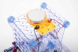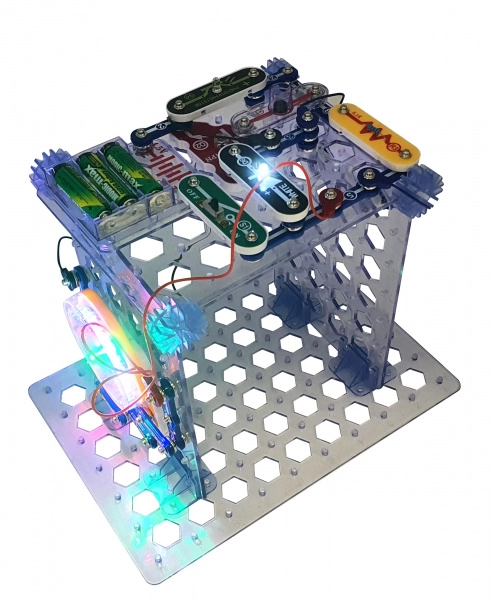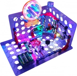 Todas las piezas se acoplan fácilmente a la rejilla transparente. La construcción es rápida, clara e ideal para los primeros pasos en electrónica.