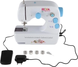La máquina se alimenta con 4 pilas AAA, que no están incluidas, o con una fuente de alimentación externa incluida en el paquete. El paquete también incluye bobinas y una aguja de repuesto, lo que permite una costura sin contratiempos.