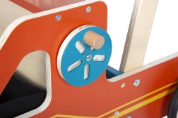 La diversión y el desarrollo de la motricidad fina están garantizados por detalles funcionales: engranajes, rueda giratoria con manivela y luces azules móviles. La cesta extraíble de fieltro sirve como espacio de almacenamiento para juguetes y pequeños objetos, para que cada intervención sea rápida y organizada.