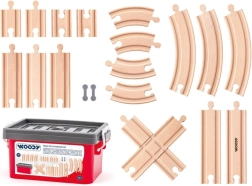 El práctico set incluye 20 piezas de vías de madera para circuitos de trenes, guardadas en una caja de plástico resistente para un almacenamiento fácil. Ampliación ideal para trenes infantiles, adecuada a partir de 3 años y con conformidad CE.